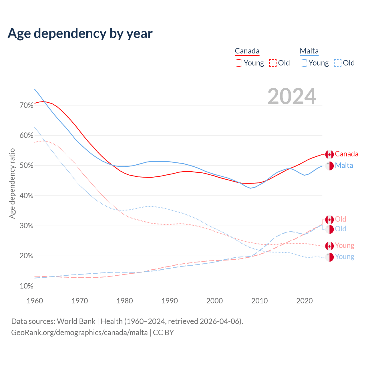 Data sources: World Bank | Health (1960–2024, retrieved 2026-04-06); U.S. Census Bureau (1960–2024, retrieved 2026-02-08).