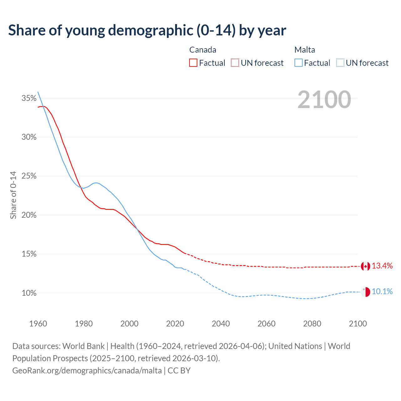 - The share of young demographic (0-15 years old) in Canada is 15.1% vs 13% in Malta.