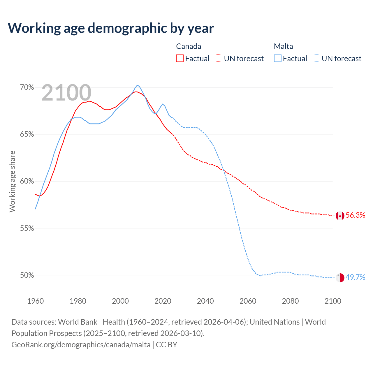 Median age Canada vs Malta, 1960-2100