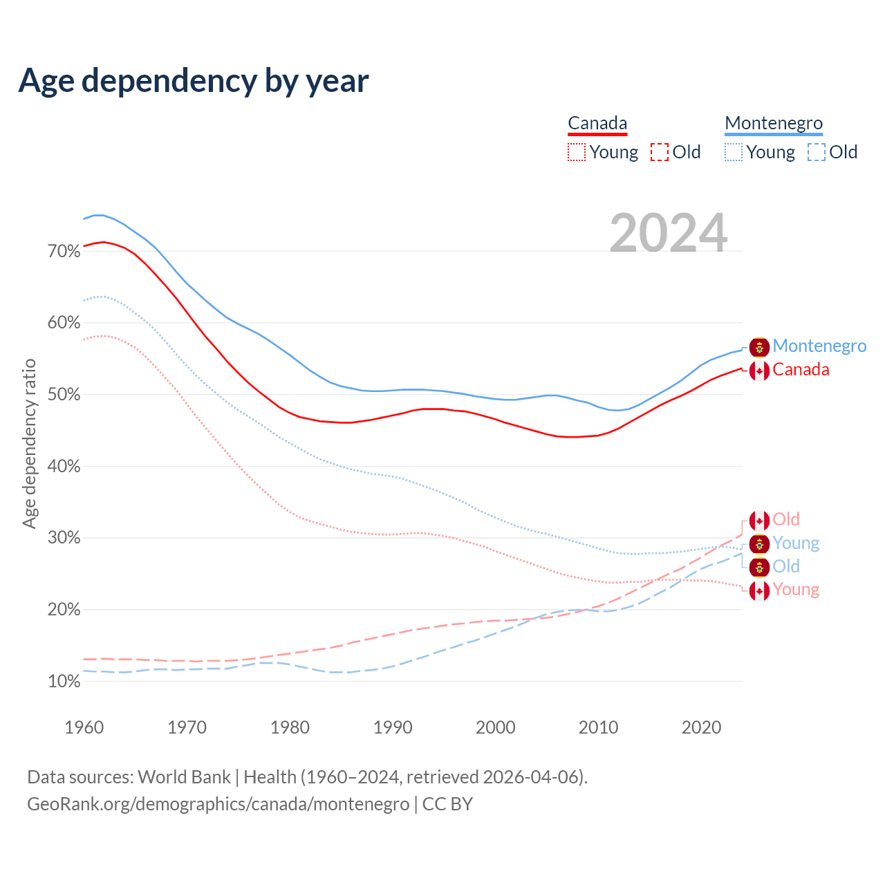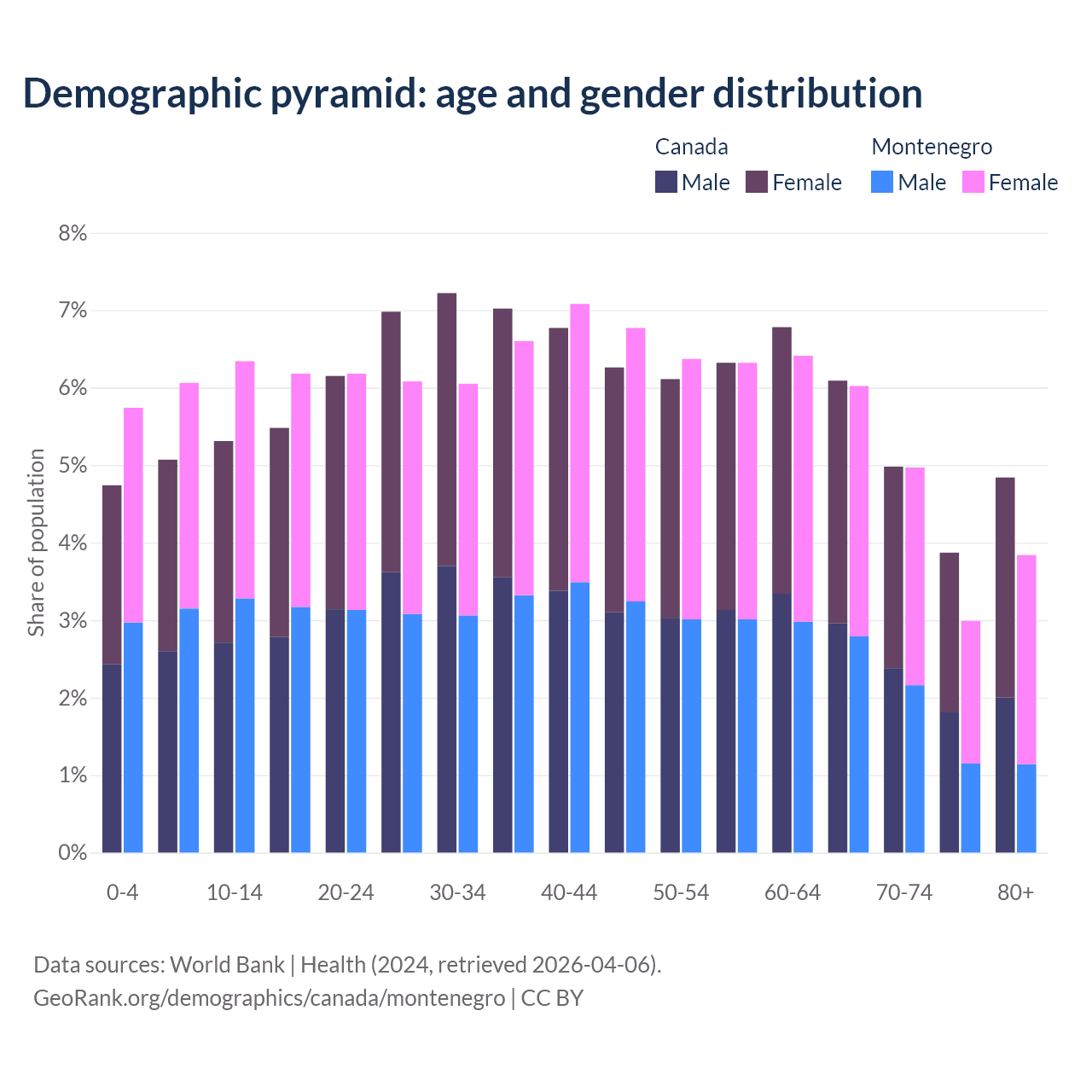 - Canada is ranked 38/196 by median age (oldest to youngest) vs 45/196 for Montenegro.