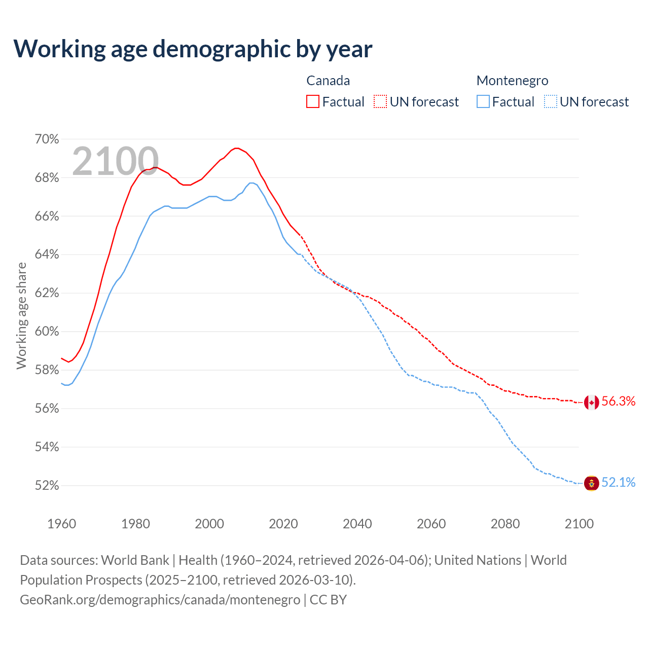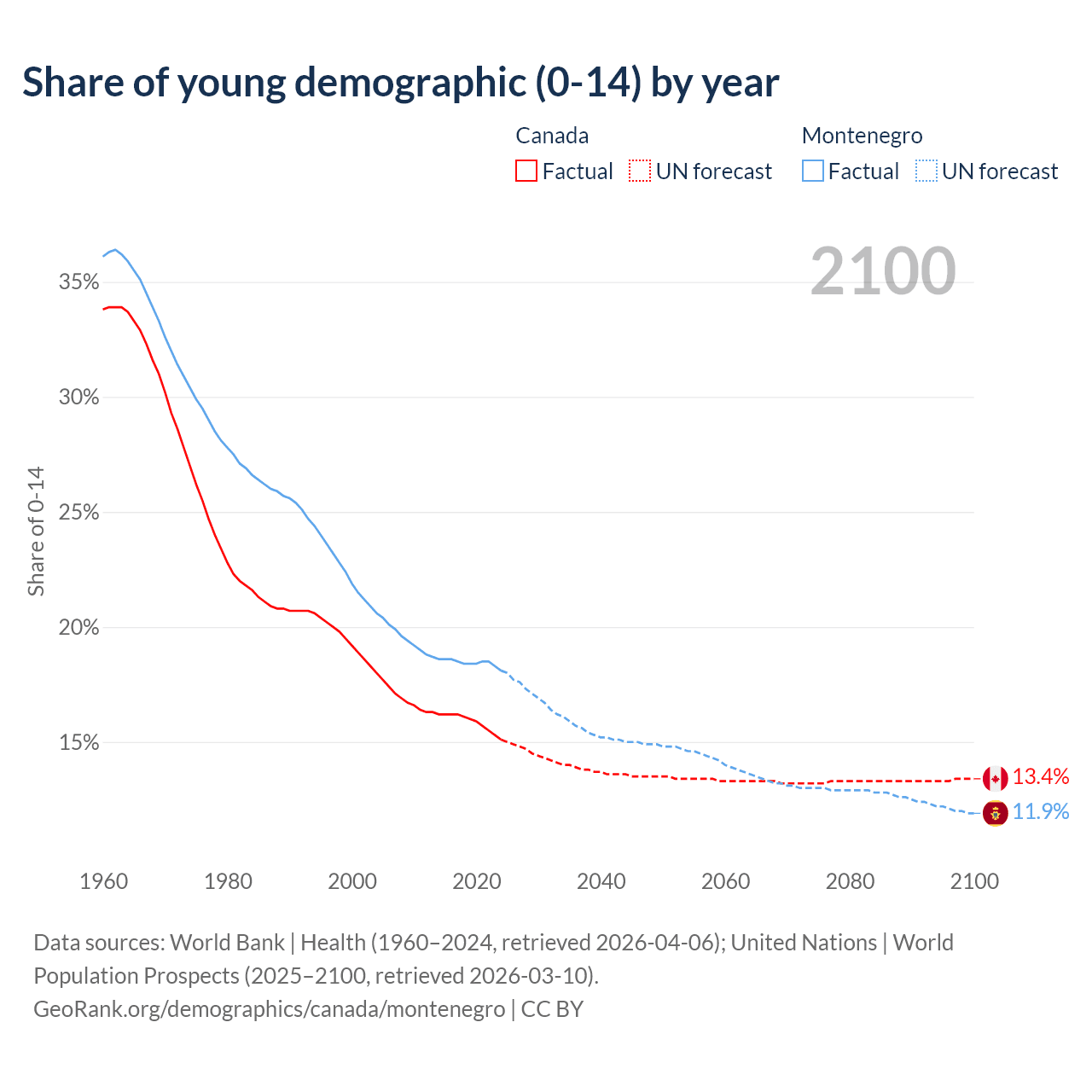 - The share of young demographic (0-15 years old) in Canada is 15.1% vs 18.1% in Montenegro.