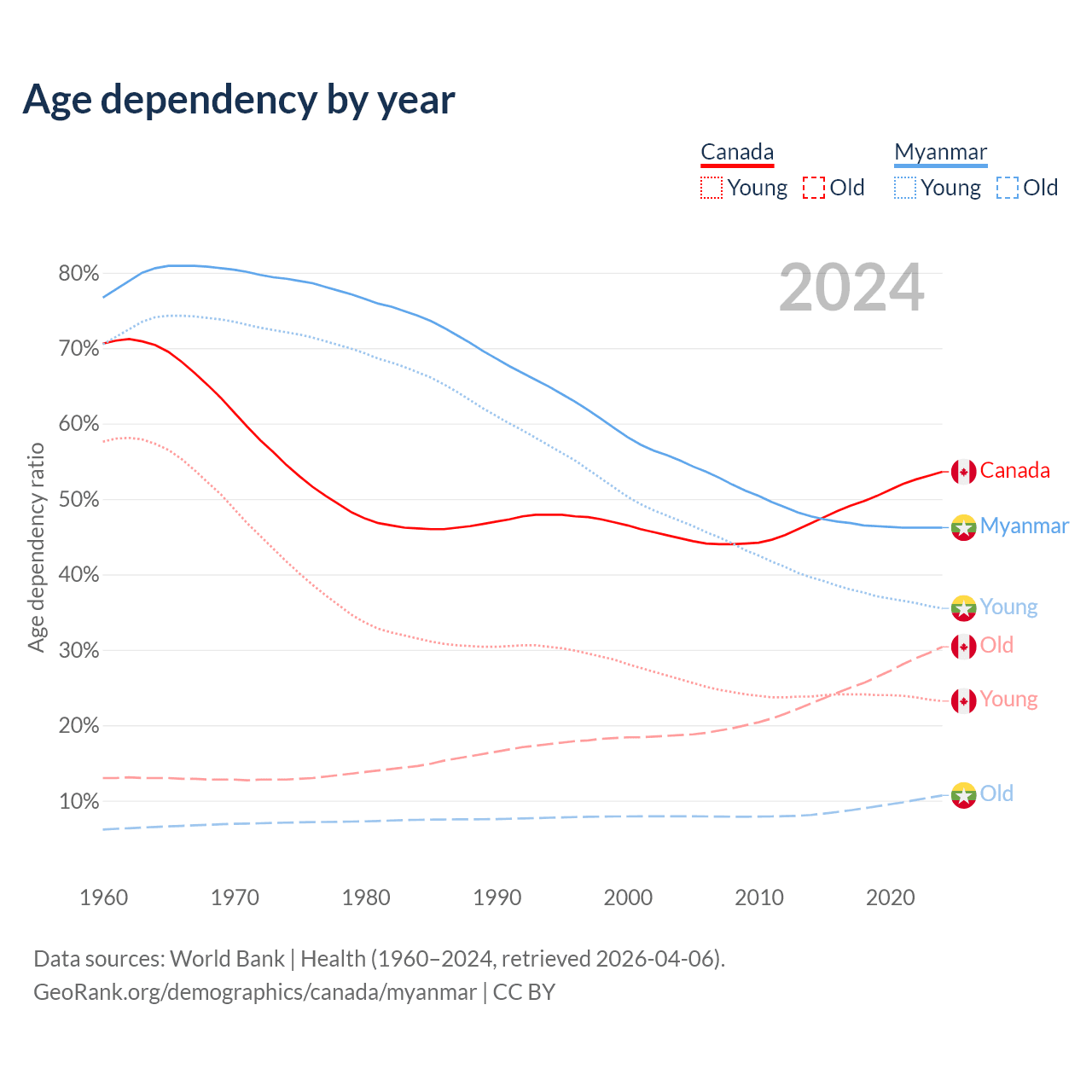 - Canada is ranked 38/196 by median age (oldest to youngest) vs 96/196 for Myanmar.