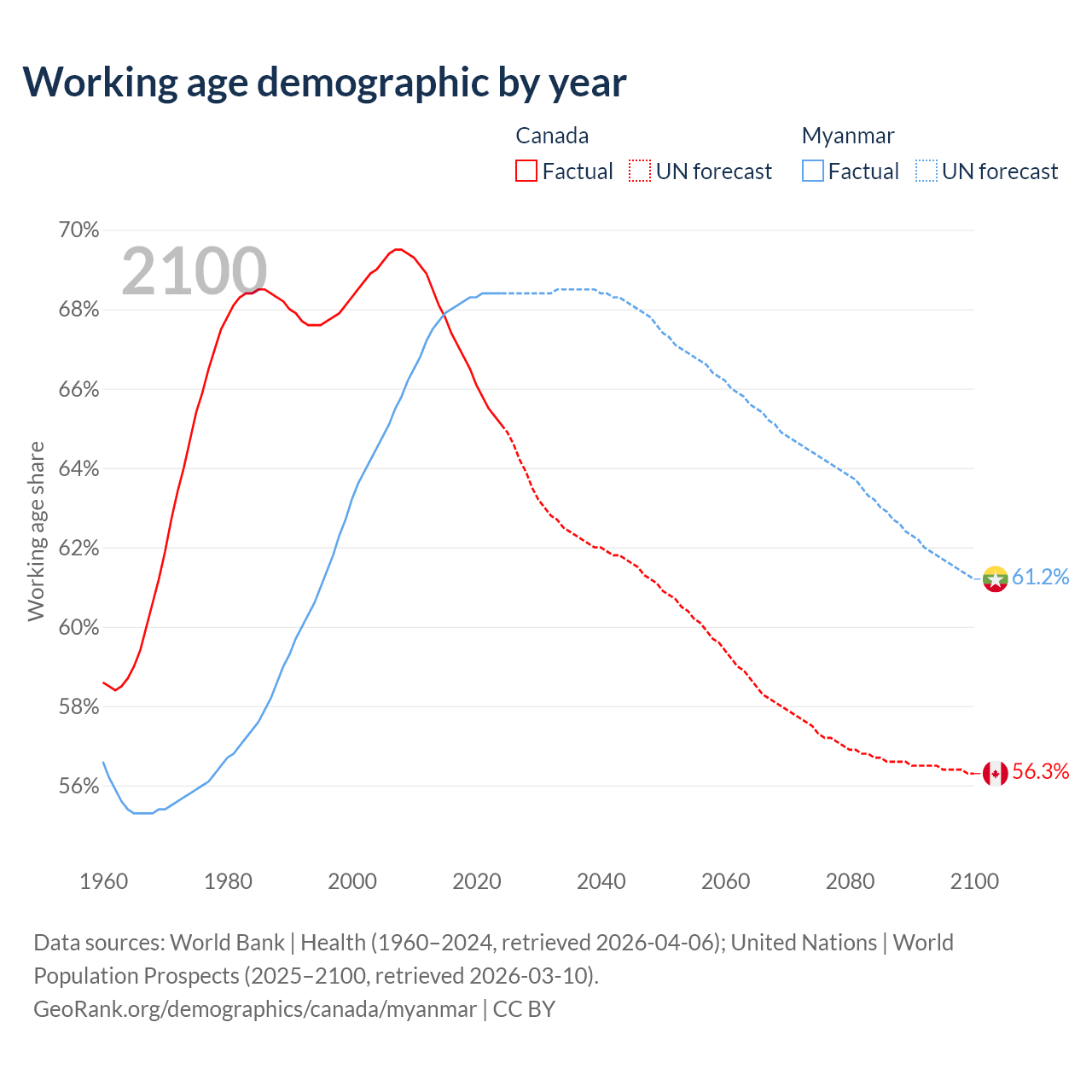 - Canada has 27.5M working age adults (aged 15-64) vs 37.8M in Myanmar.