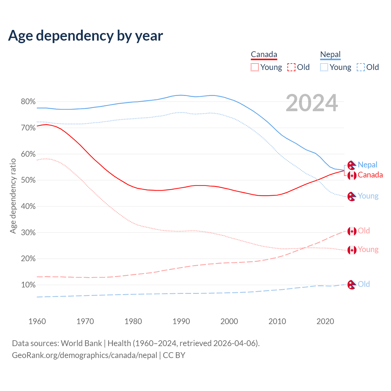 - The share of old-age demographic (65+) in Canada is 19.8% vs 6.5% in Nepal.