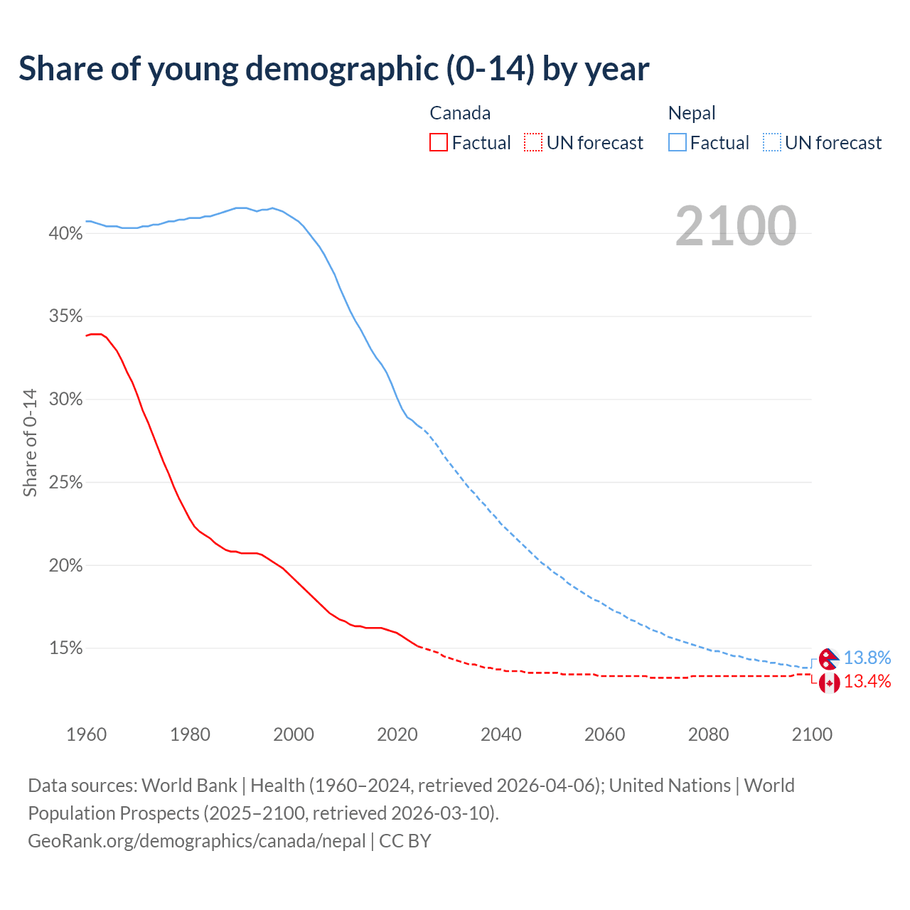 - The share of young demographic (0-15 years old) in Canada is 15.1% vs 28.4% in Nepal.