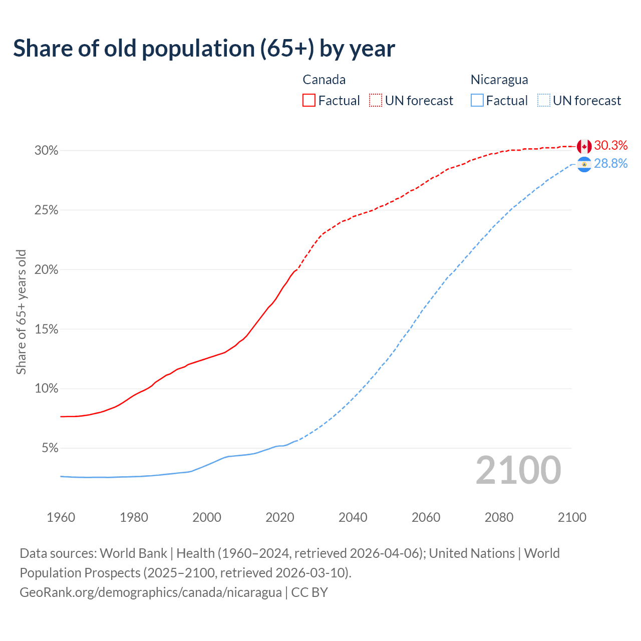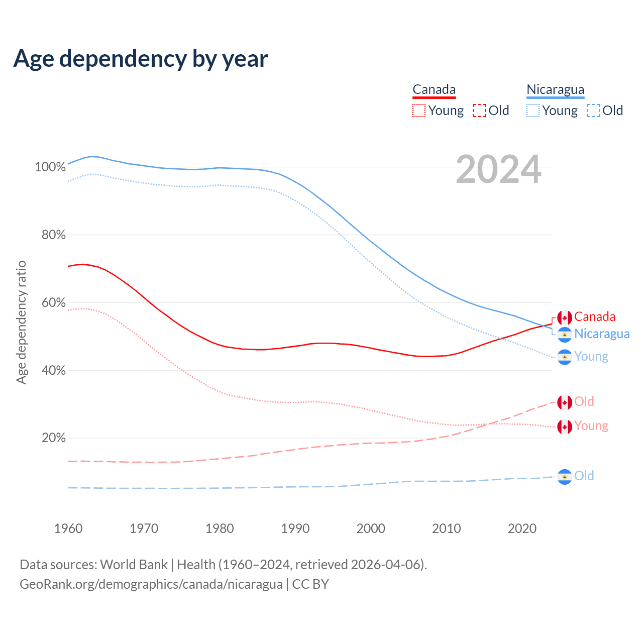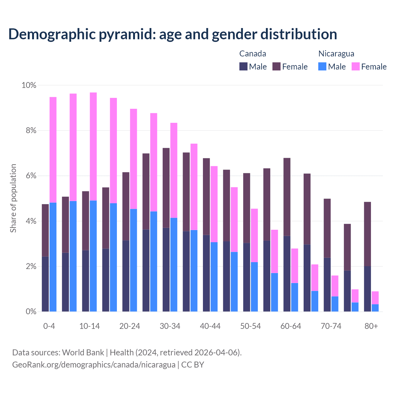 - The share of old-age demographic (65+) in Canada is 19.8% vs 5.53% in Nicaragua.