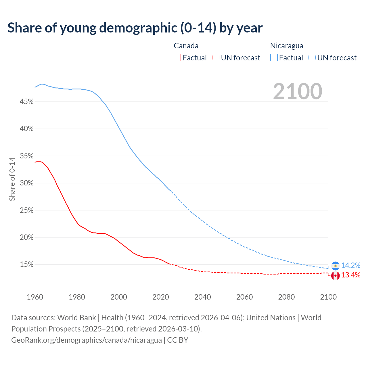 - The share of young demographic (0-15 years old) in Canada is 15.1% vs 28.8% in Nicaragua.