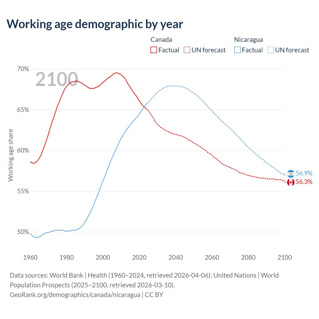 - Canada has 27.5M working age adults (aged 15-64) vs 4.68M in Nicaragua.