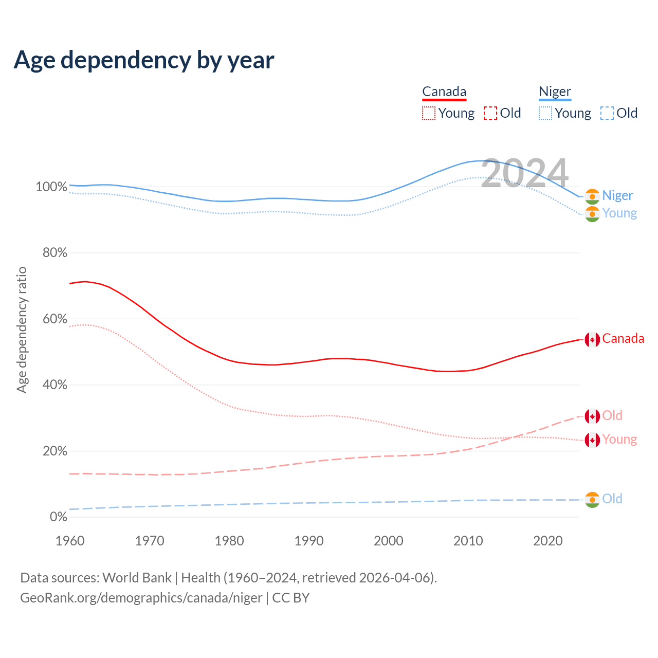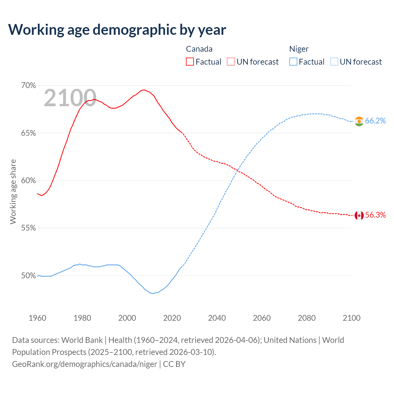- Canada has 27.5M working age adults (aged 15-64) vs 14.8M in Niger.