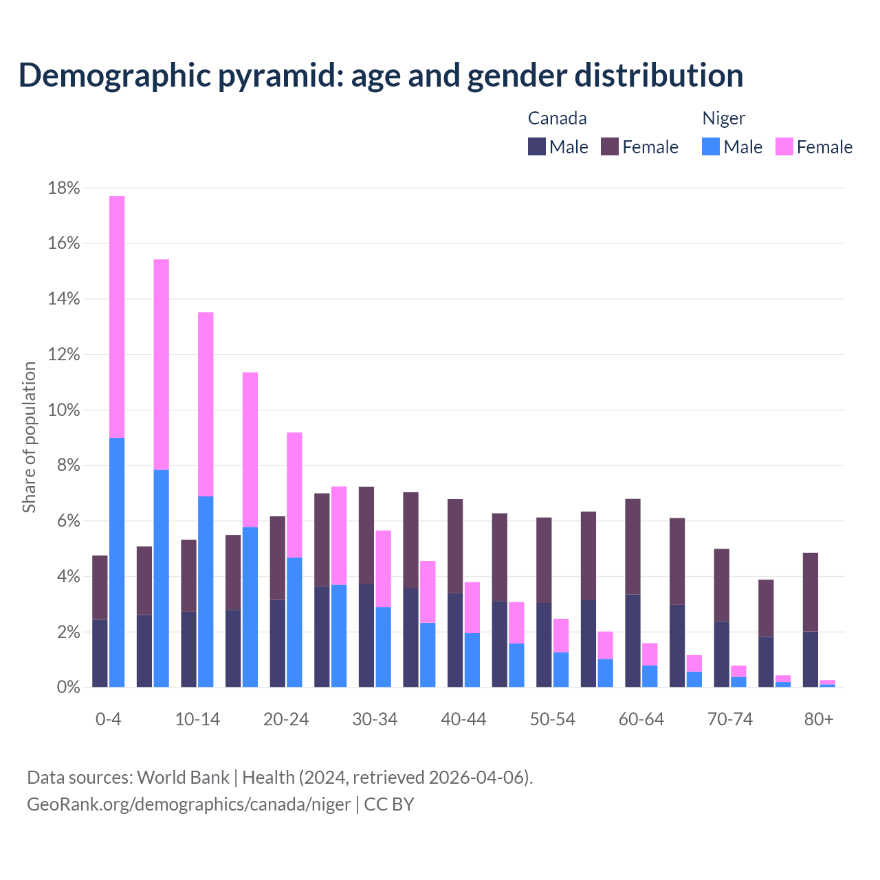 - As of 2026, the population of Canada is 42.2M vs 29.1M in Niger - 1.45 times difference.