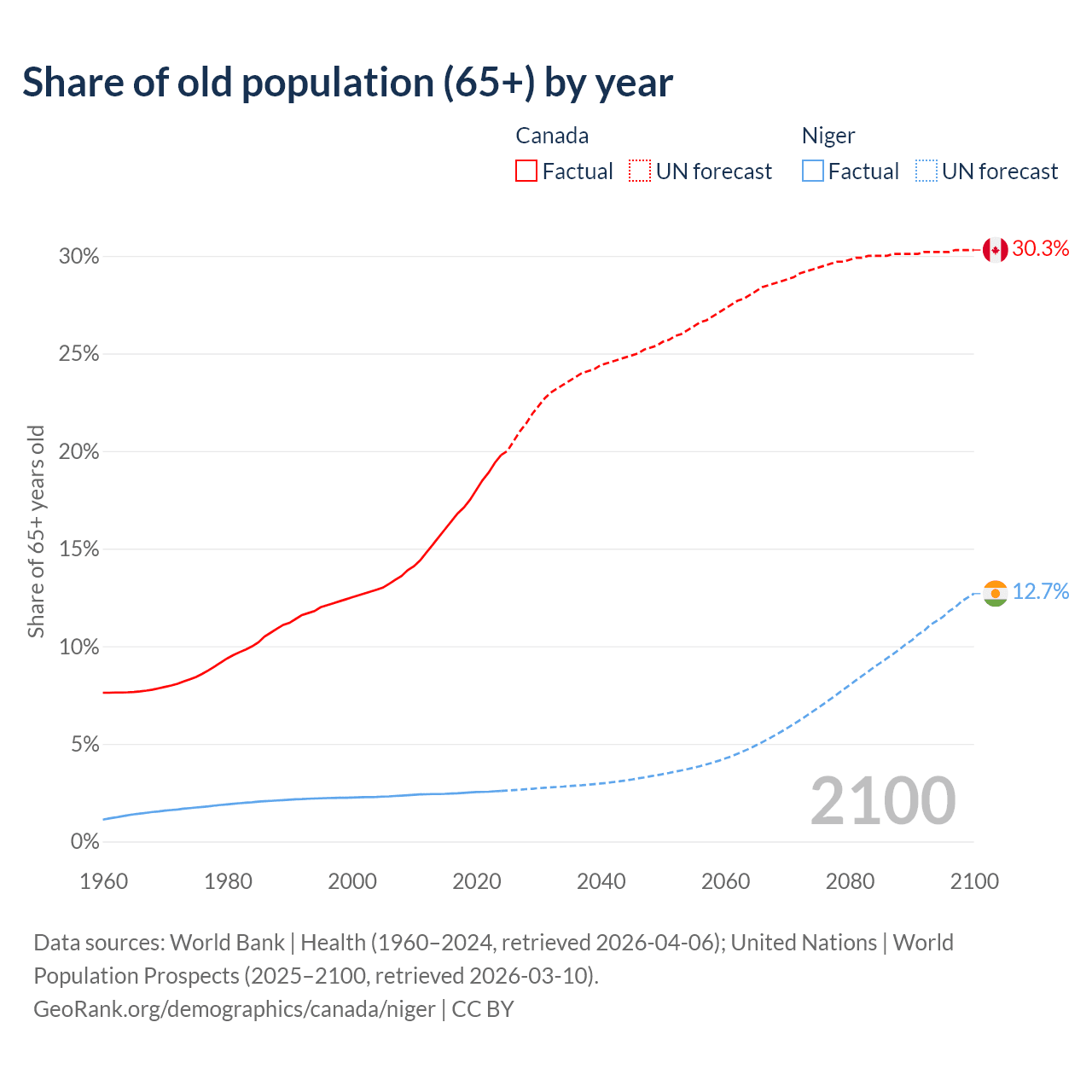 The share of older people aged 65 and over is 19.8% in Canada and 2.59% in Niger. Life expectancy in Canada compared to Niger .
