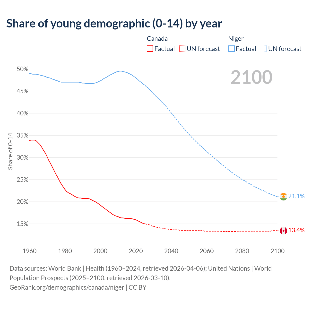 - The share of young demographic (0-15 years old) in Canada is 15.1% vs 46.6% in Niger.