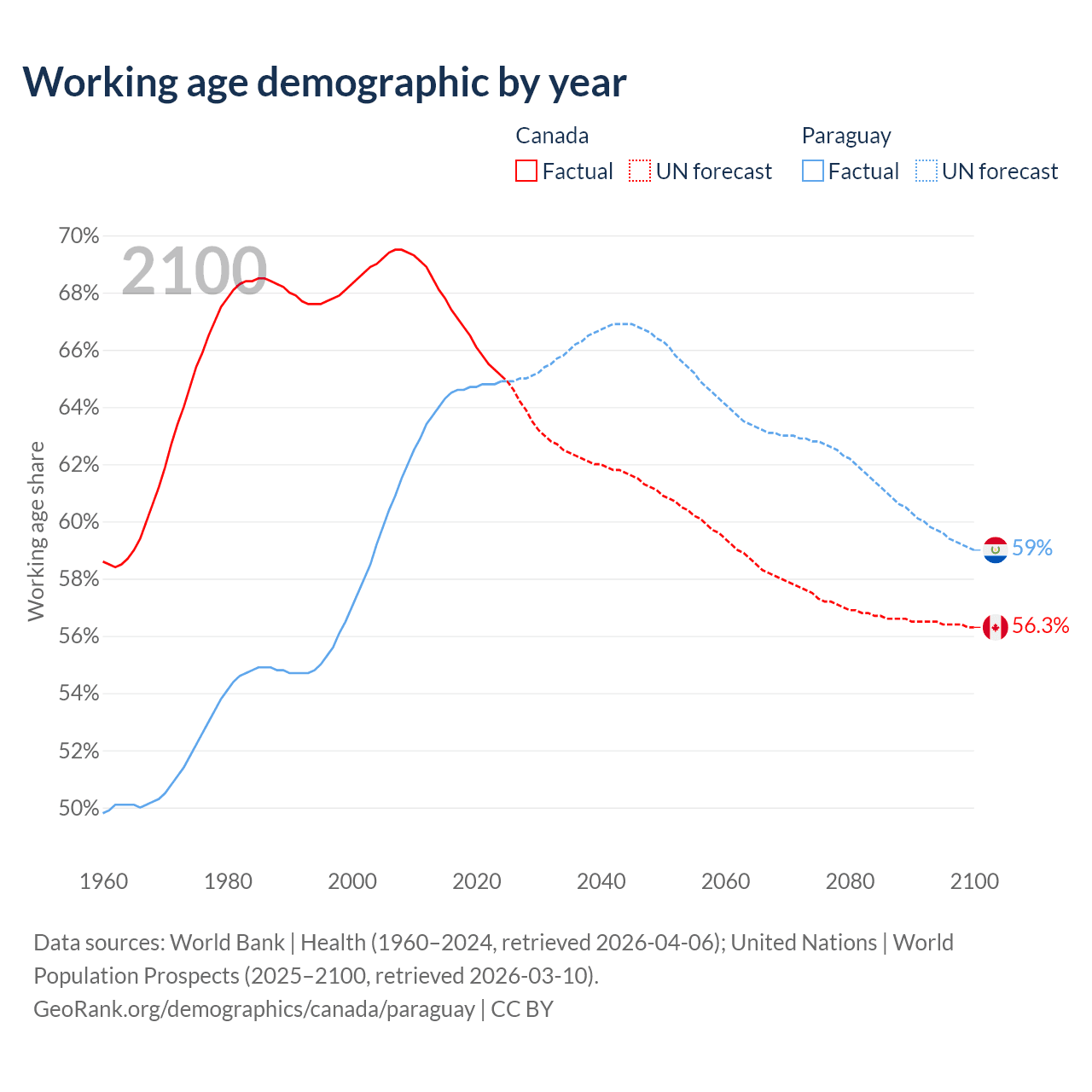 - Canada has 27.5M working age adults (aged 15-64) vs 4.62M in Paraguay.