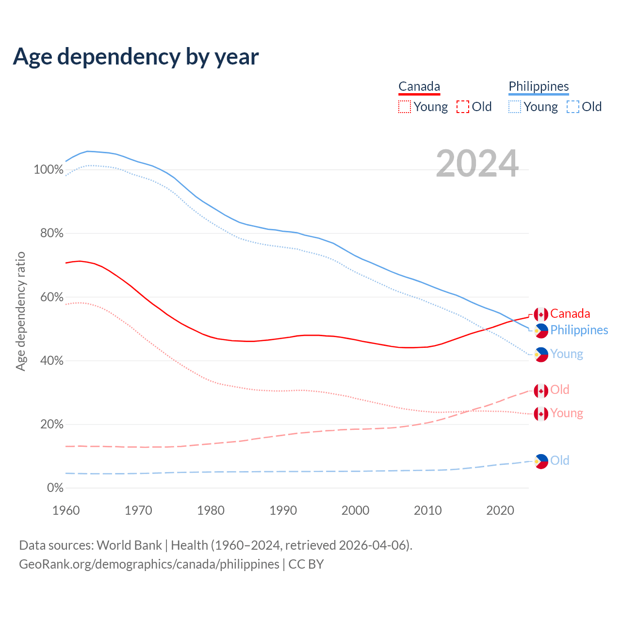 - Canada is ranked 38/196 by median age (oldest to youngest) vs 123/196 for the Philippines.