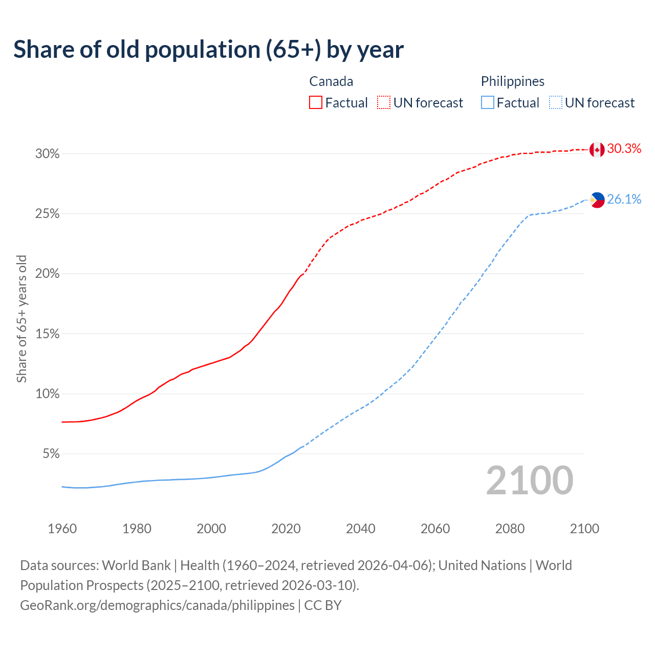 - The share of old-age demographic (65+) in Canada is 19.8% vs 5.49% in the Philippines.