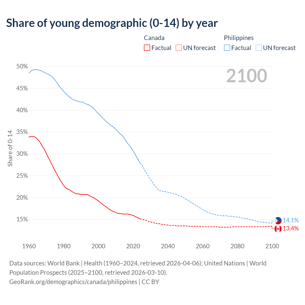 - The share of young demographic (0-15 years old) in Canada is 15.1% vs 27.9% in the Philippines.