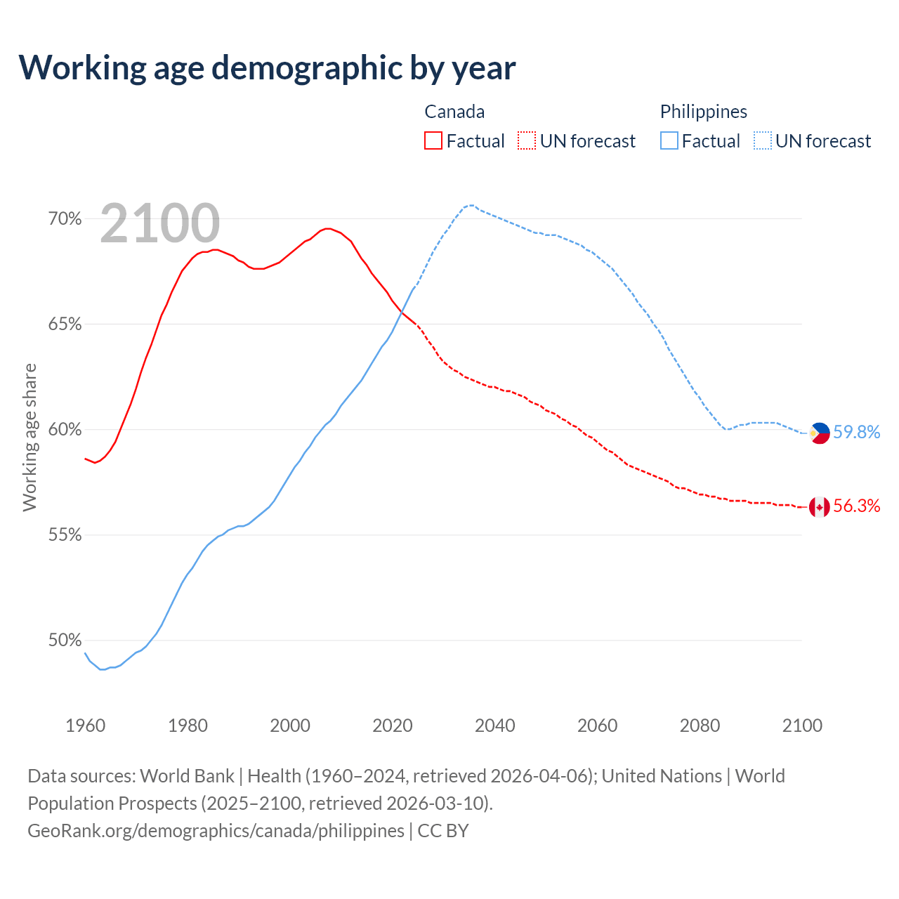 - Canada has 27.5M working age adults (aged 15-64) vs 78.6M in the Philippines.