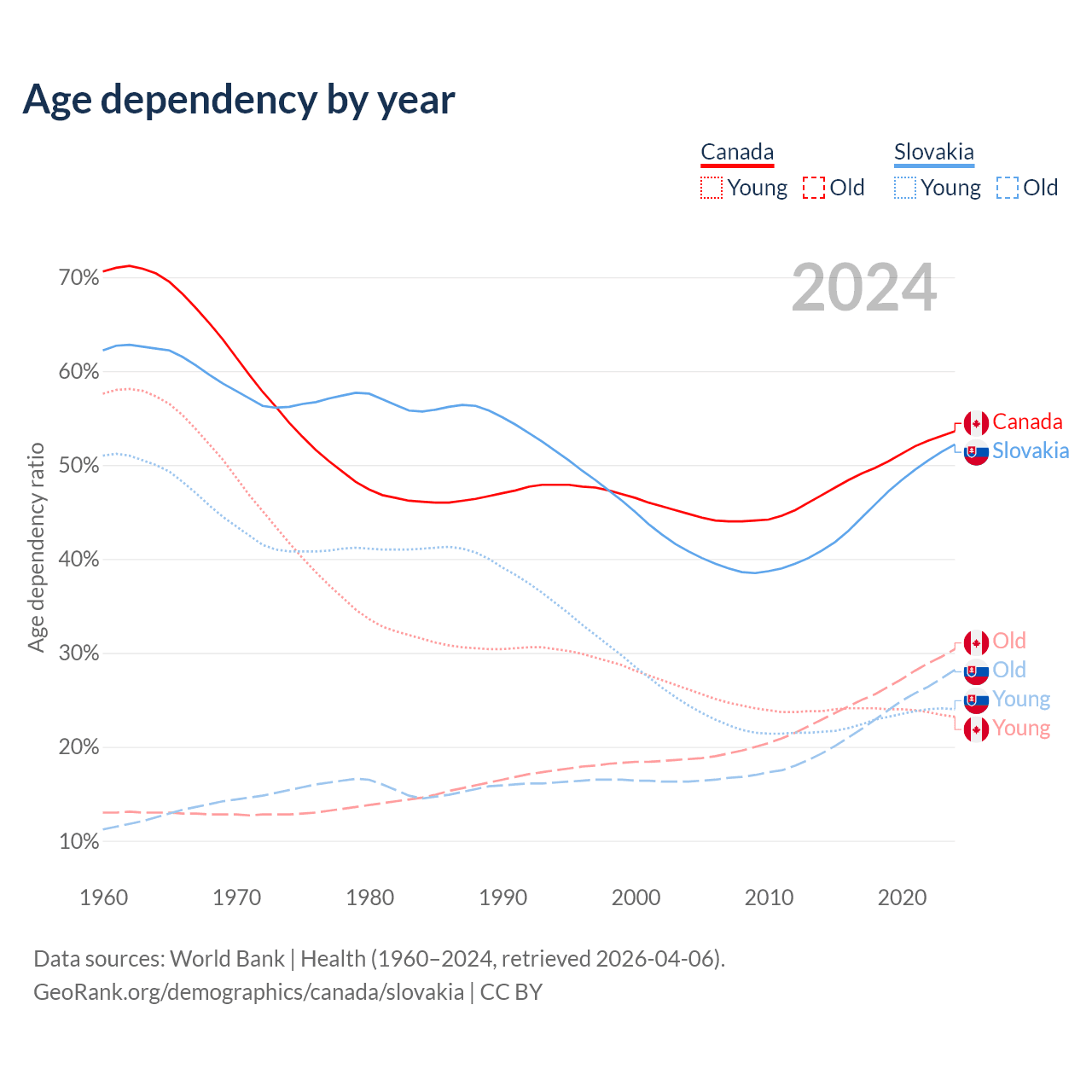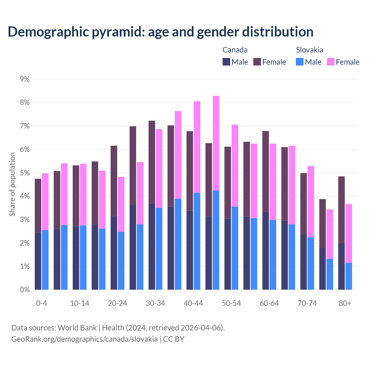 - Canada is ranked 38/196 by median age (oldest to youngest) vs 31/196 for Slovakia.