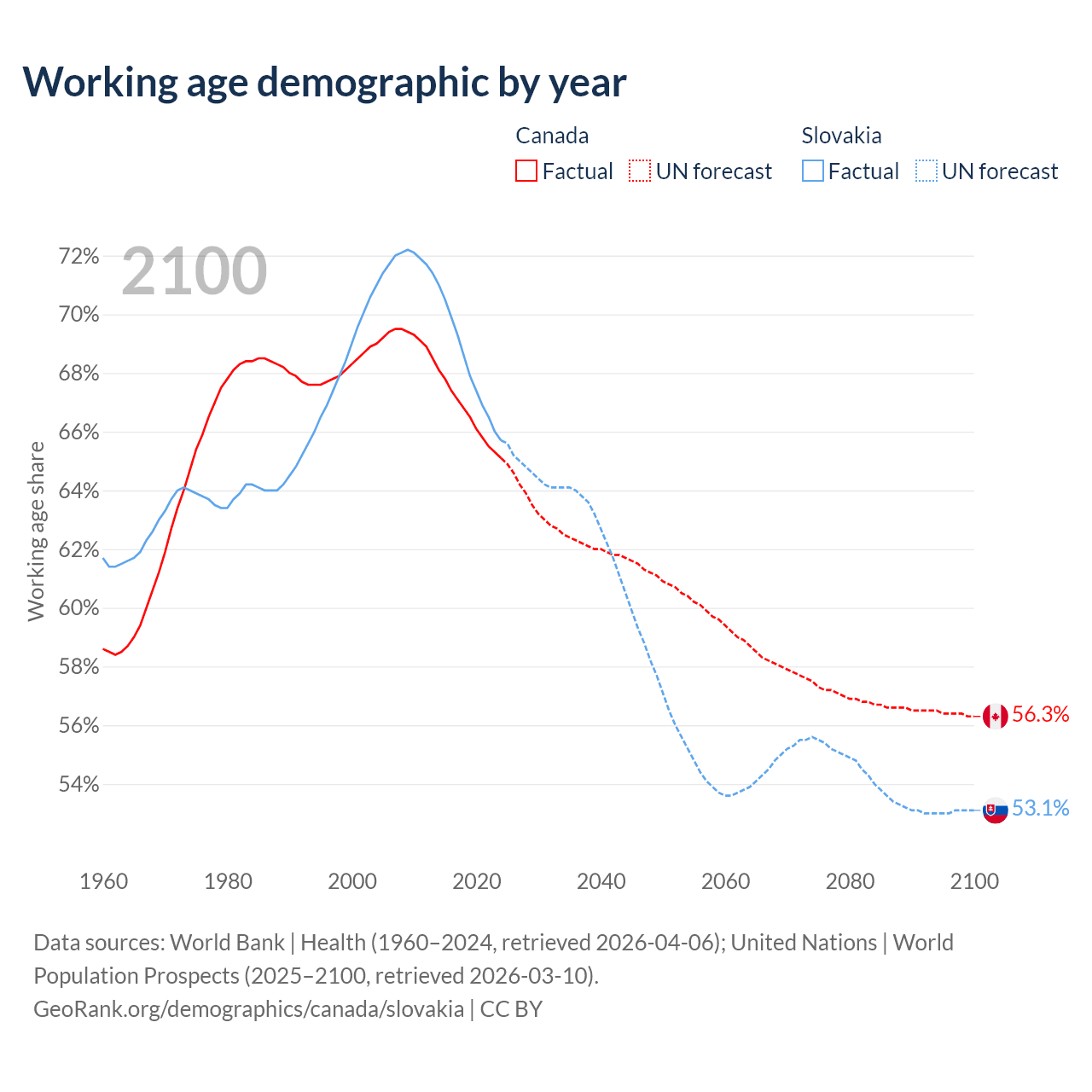 - Canada has 27.5M working age adults (aged 15-64) vs 3.52M in Slovakia.