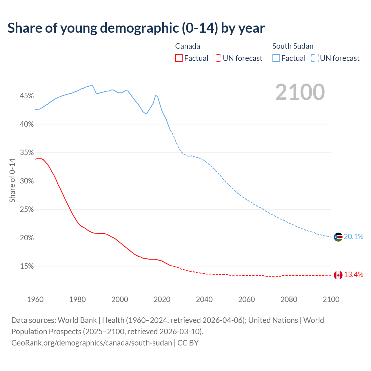 - The share of young demographic (0-15 years old) in Canada is 15.1% vs 38.9% in South Sudan.