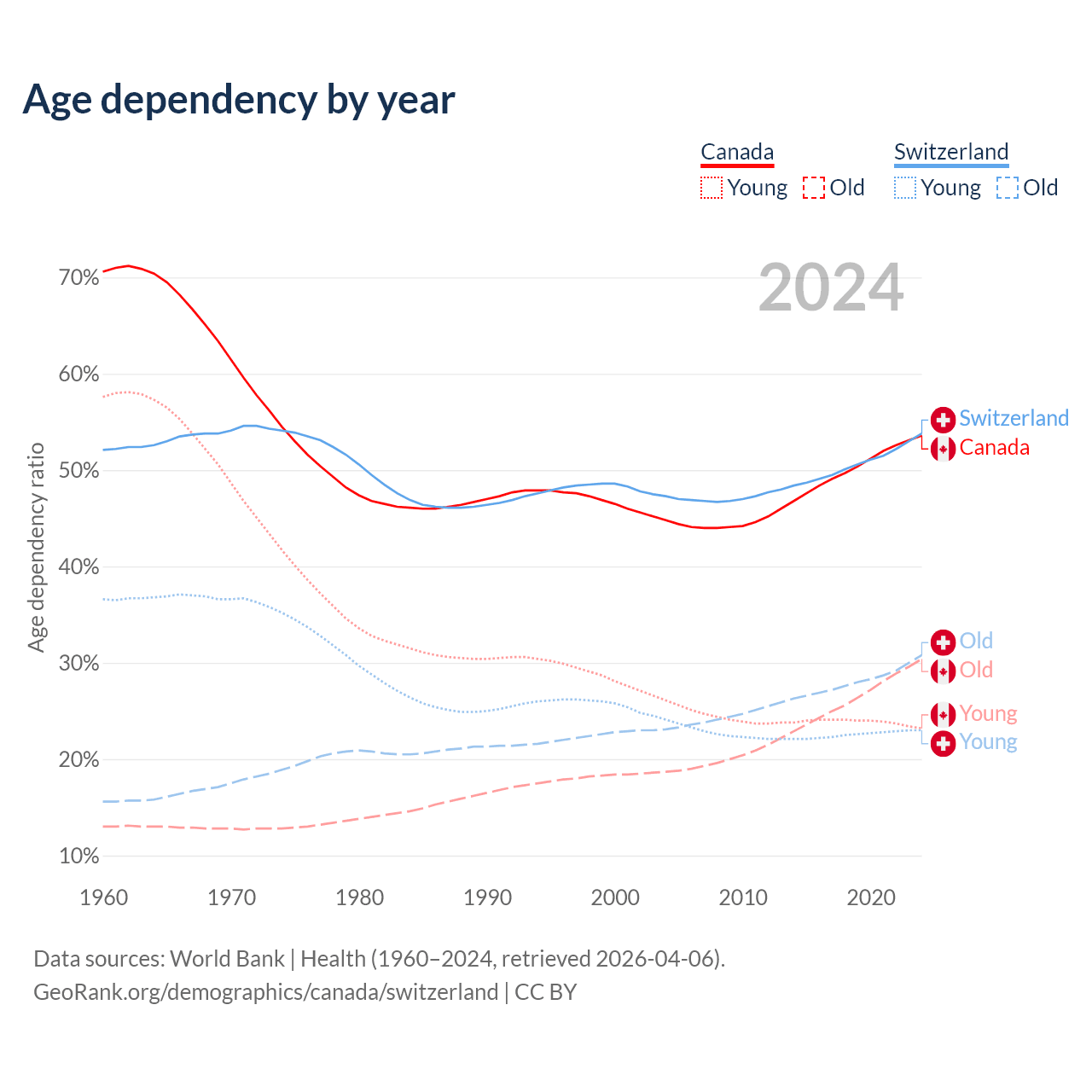 - Canada is ranked 38/196 by median age (oldest to youngest) vs 24/196 for Switzerland.