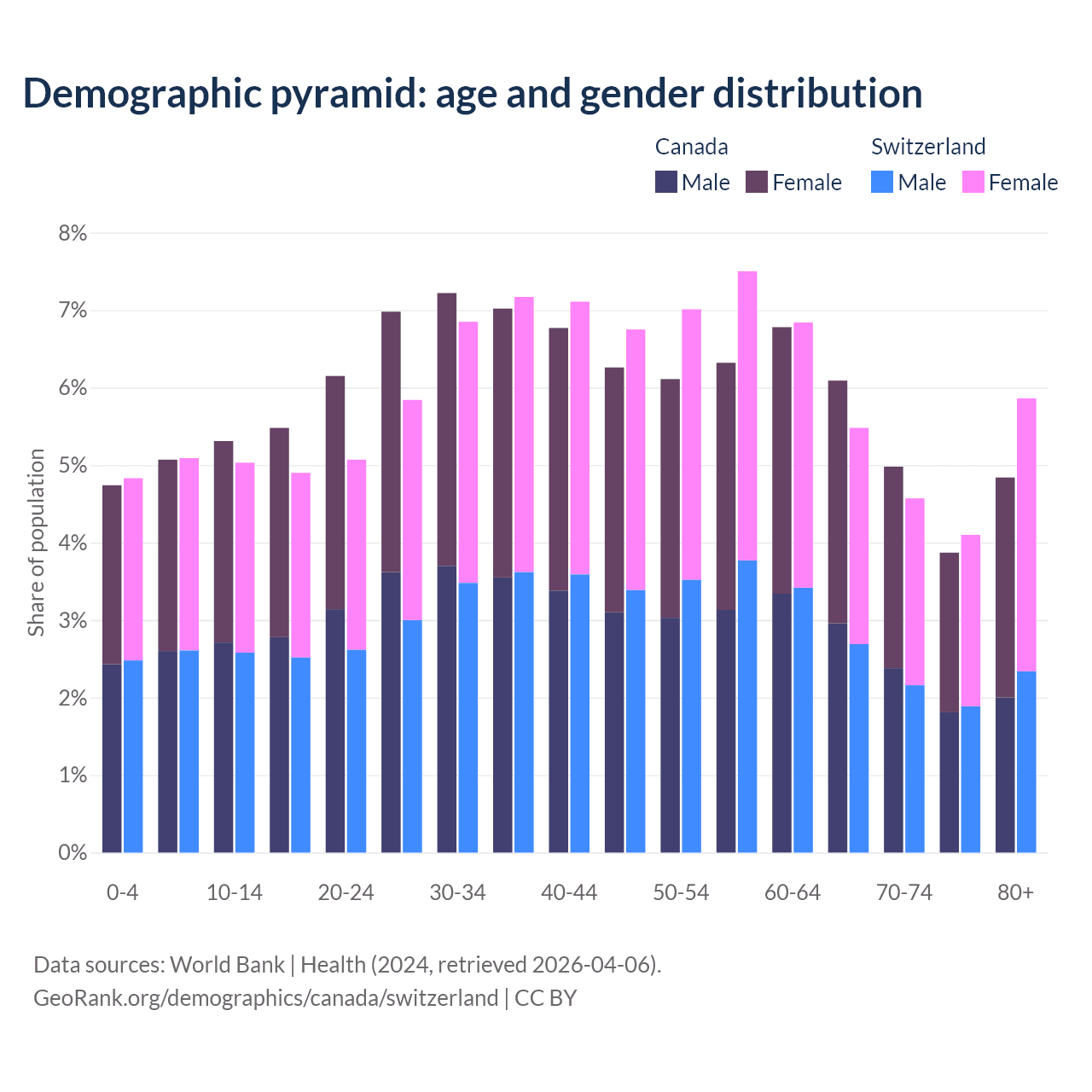 The share of older people aged 65 and over is 19.8% in Canada and 20% in Switzerland. Life expectancy in Canada compared to Switzerland .