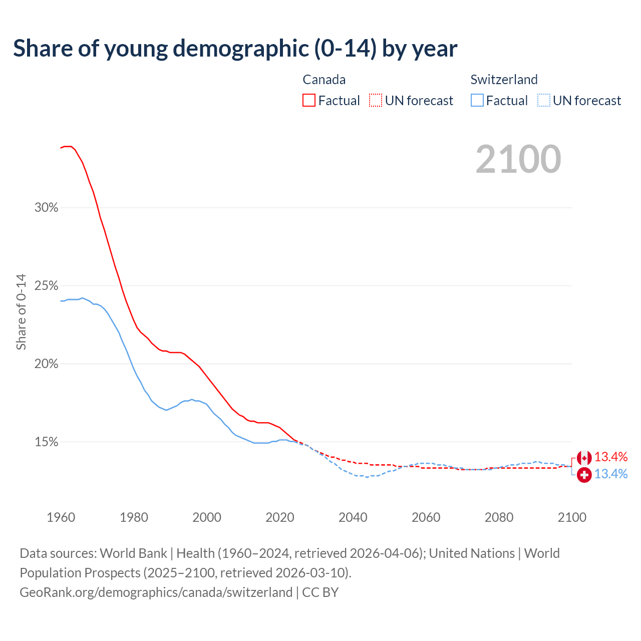- The share of young demographic (0-15 years old) in Canada is 15.1% vs 15% in Switzerland.