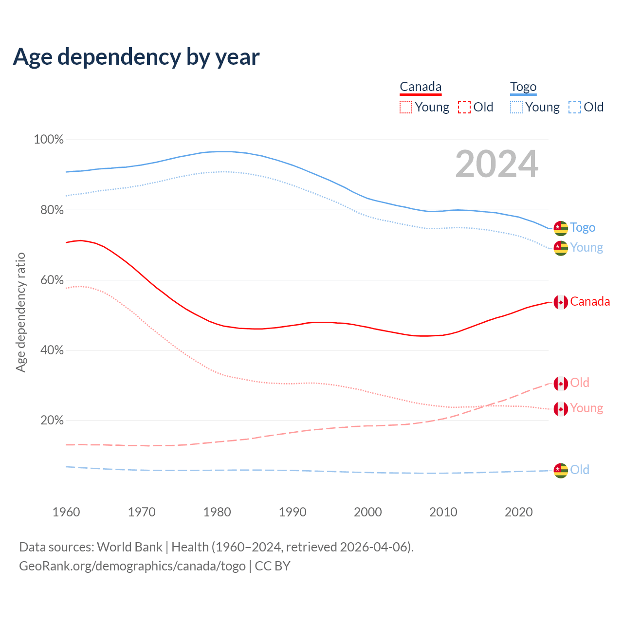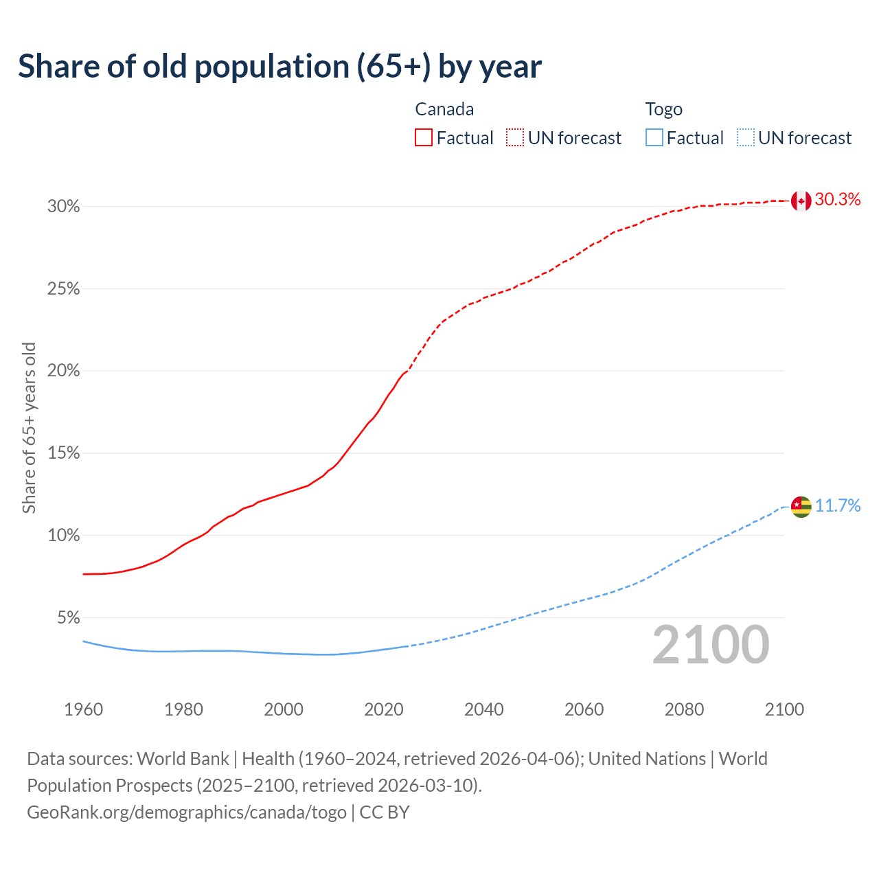 The share of older people aged 65 and over is 19.8% in Canada and 3.21% in Togo. Life expectancy in Canada compared to Togo .