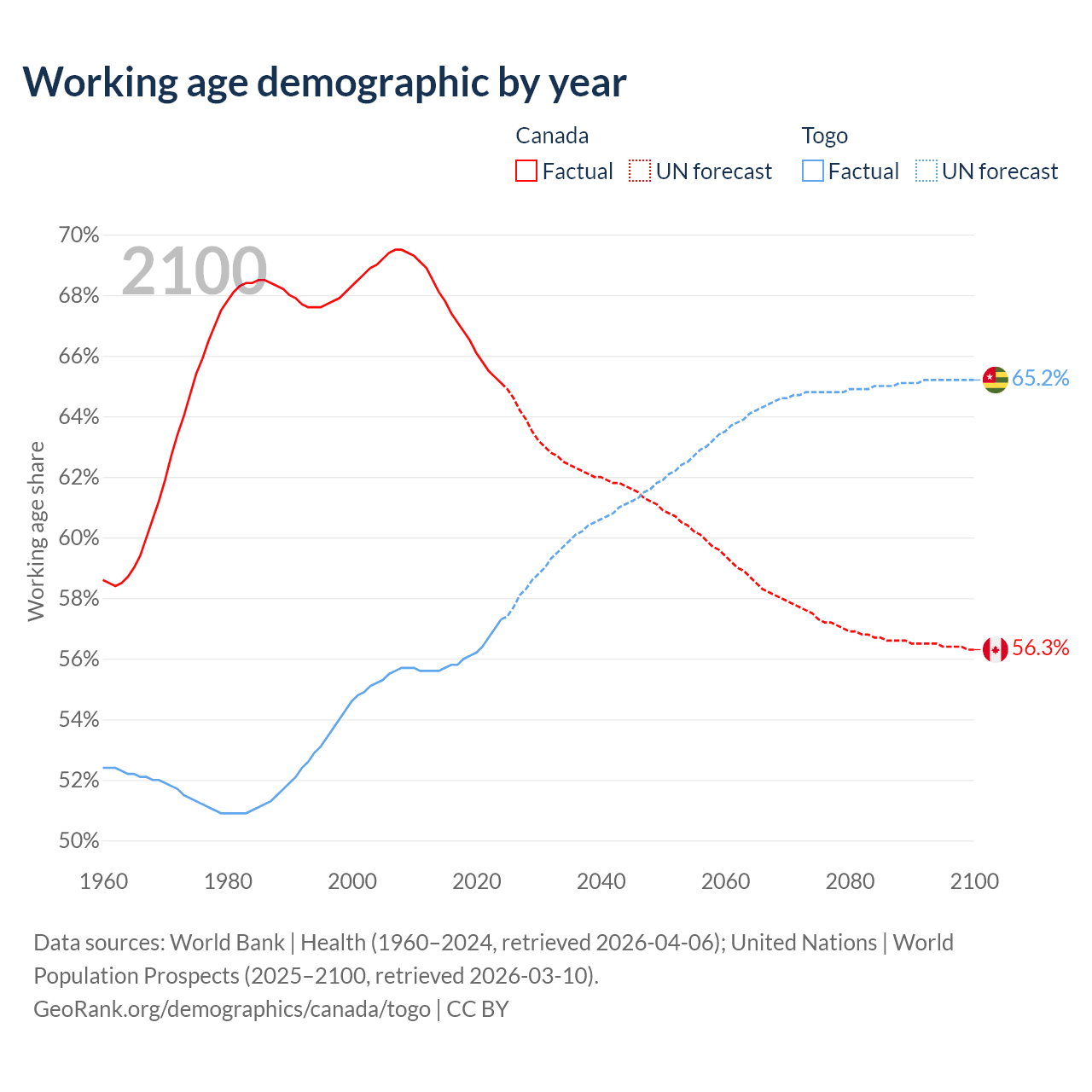 - Canada has 27.5M working age adults (aged 15-64) vs 5.72M in Togo.