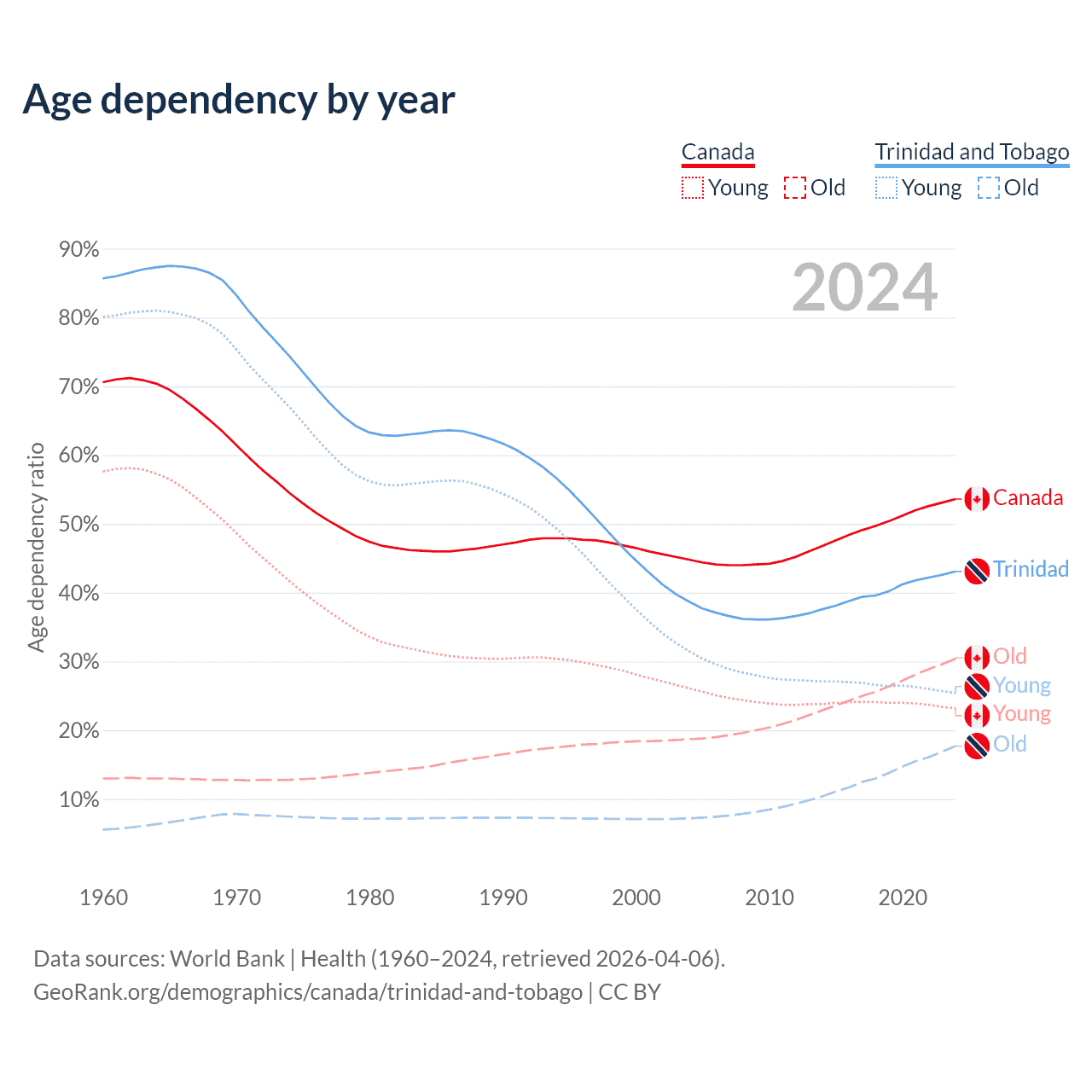 - The share of old-age demographic (65+) in Canada is 19.8% vs 12.4% in Trinidad and Tobago.