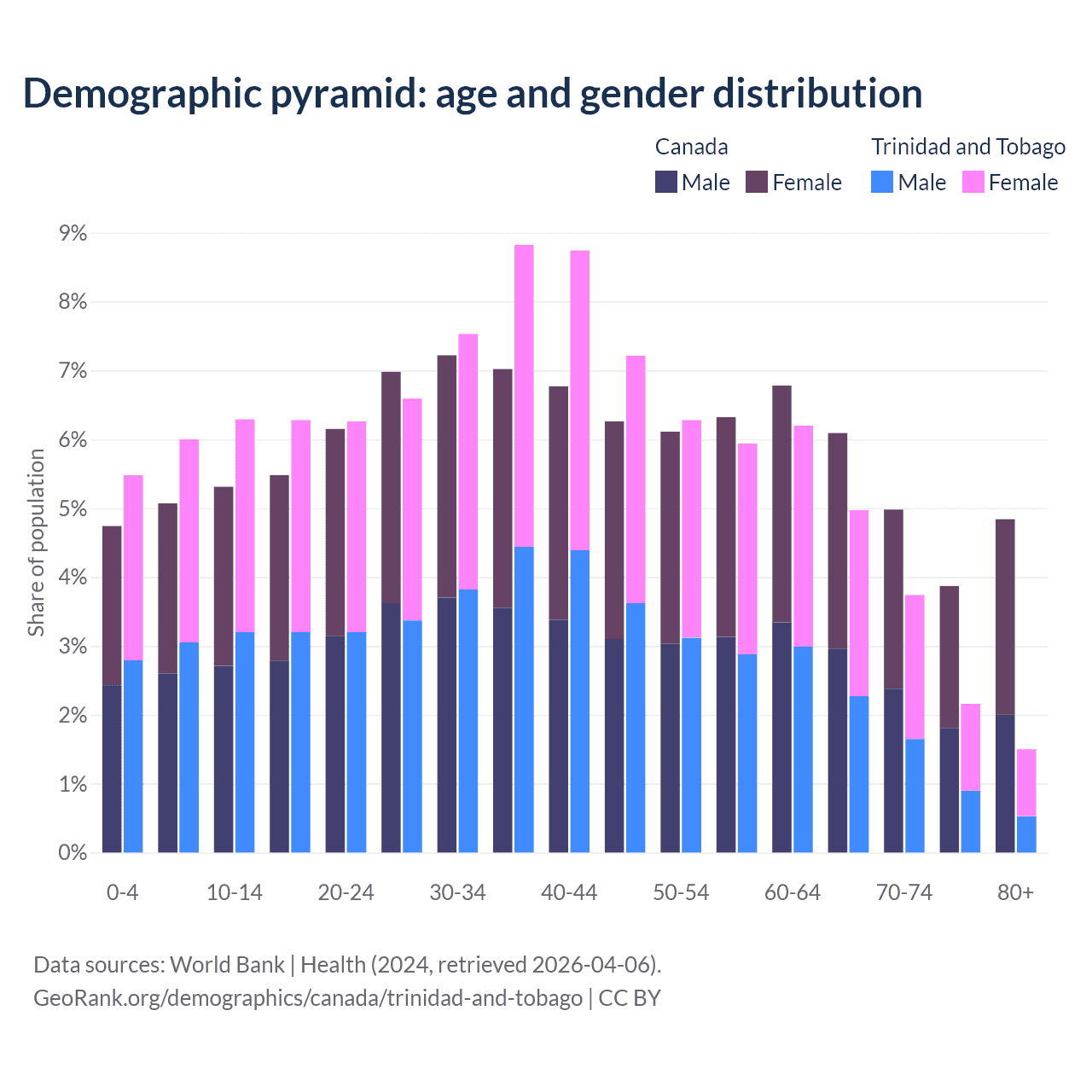 - The median age in Canada is 41.5 years compared to 38.2 years in Trinidad and Tobago.