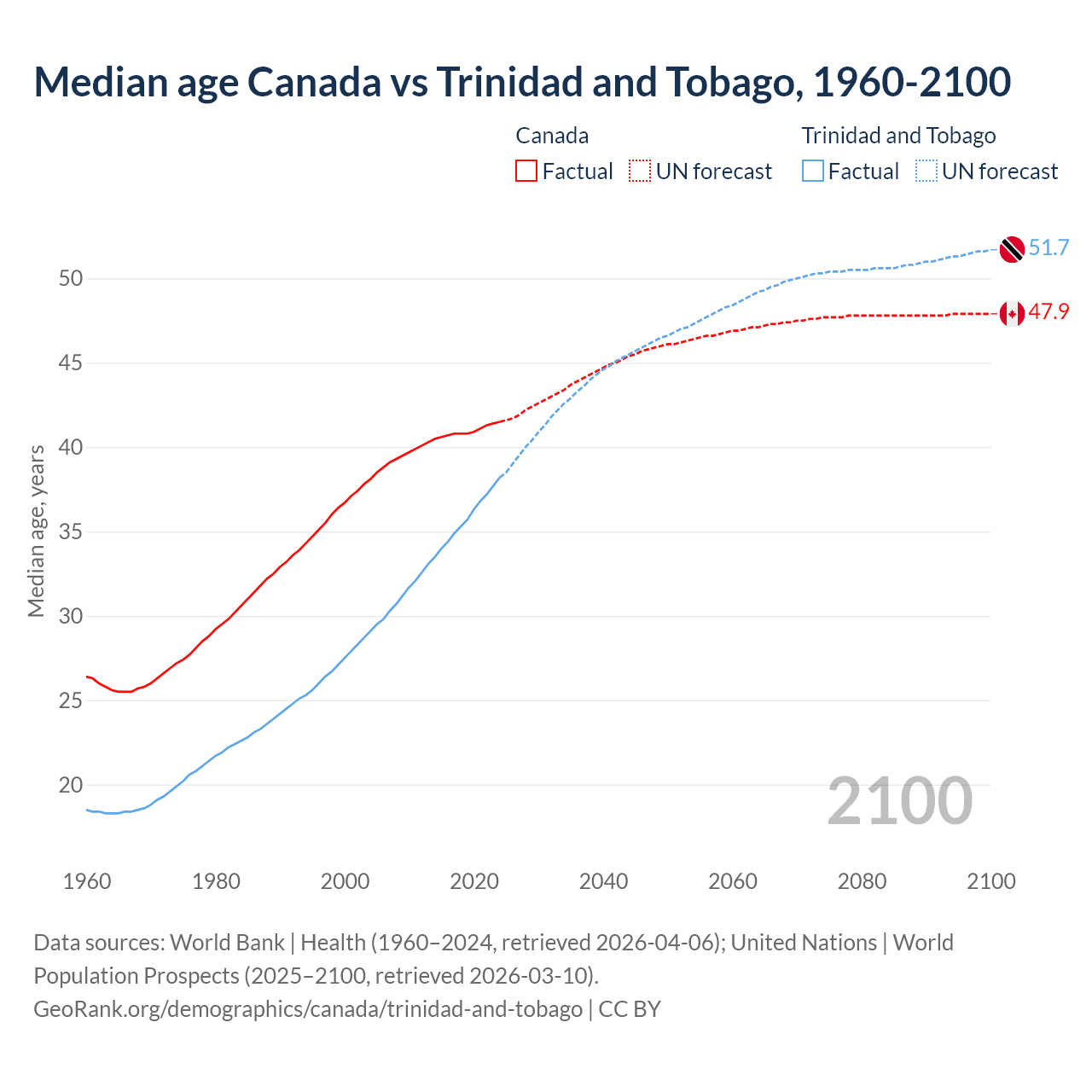 Median age Canada vs Trinidad and Tobago, 1960-2100