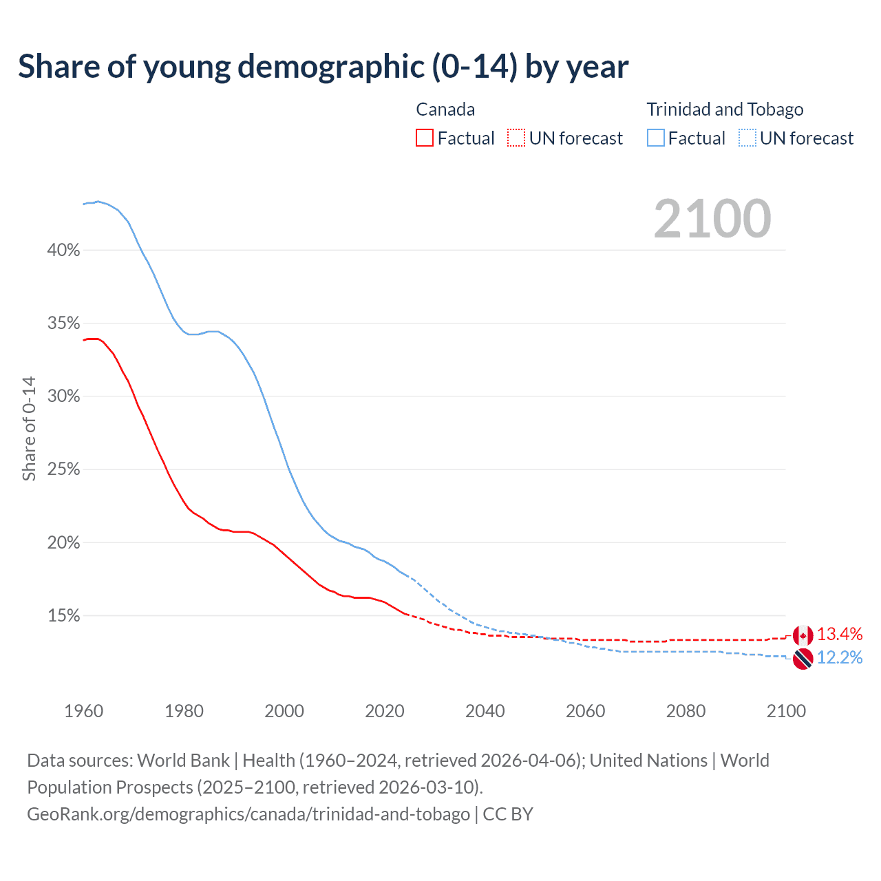 - The share of young demographic (0-15 years old) in Canada is 15.1% vs 17.8% in Trinidad and Tobago.