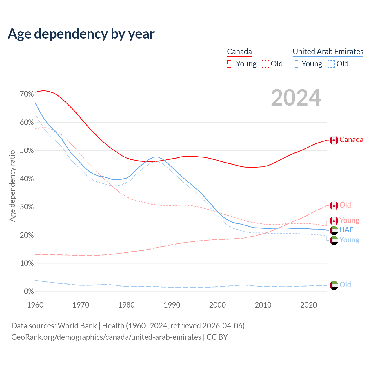 Data sources: World Bank | Health (1960–2024, retrieved 2026-04-06); U.S. Census Bureau (1960–2024, retrieved 2026-02-08).