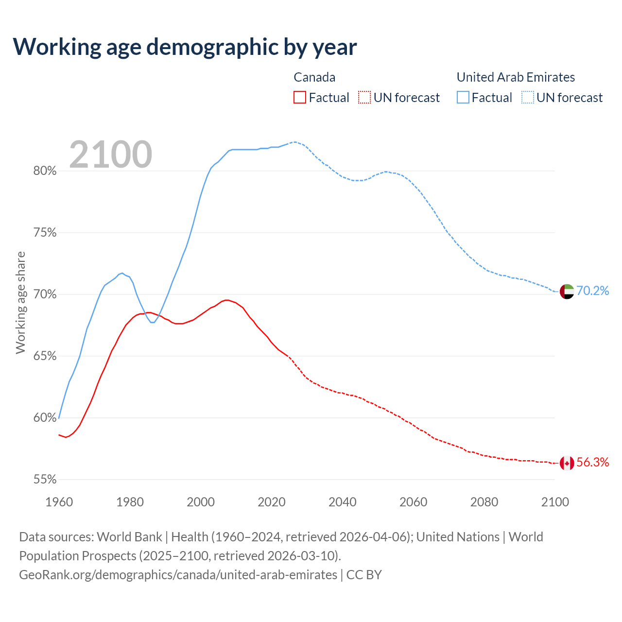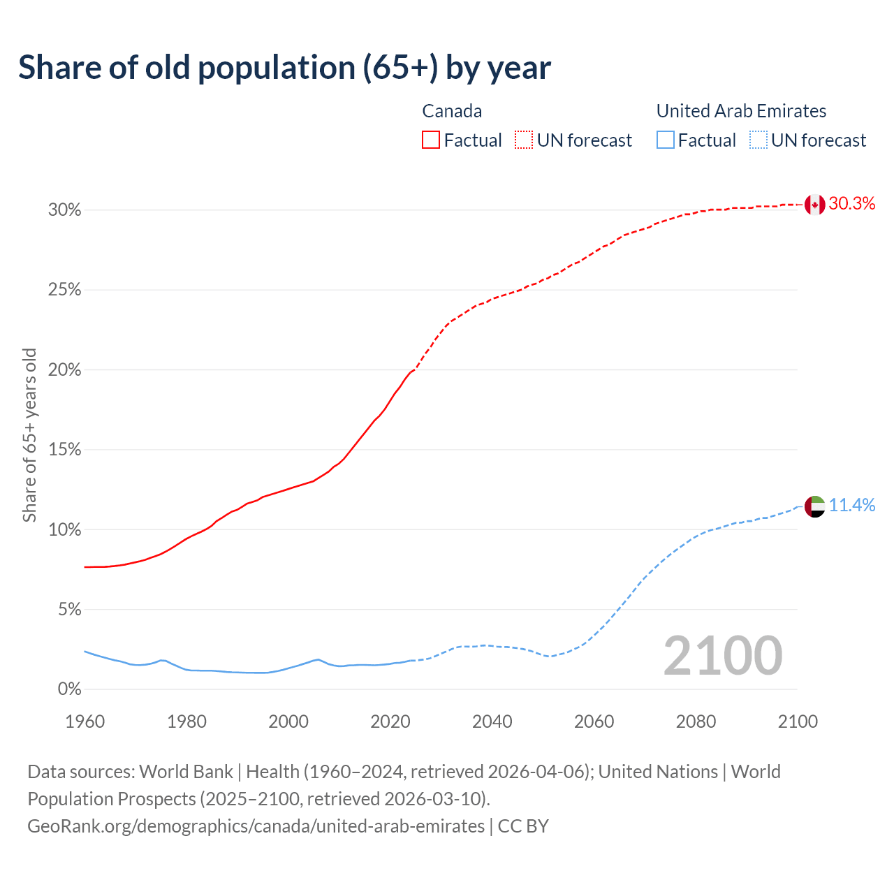 Median age Canada vs United Arab Emirates, 1960-2100