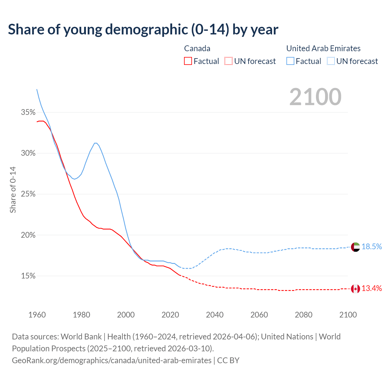 - The share of young demographic (0-15 years old) in Canada is 15.1% vs 16.1% in the United Arab Emirates.
