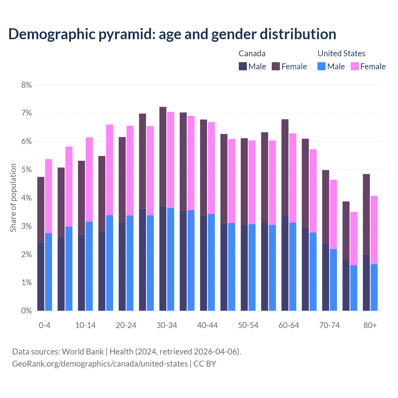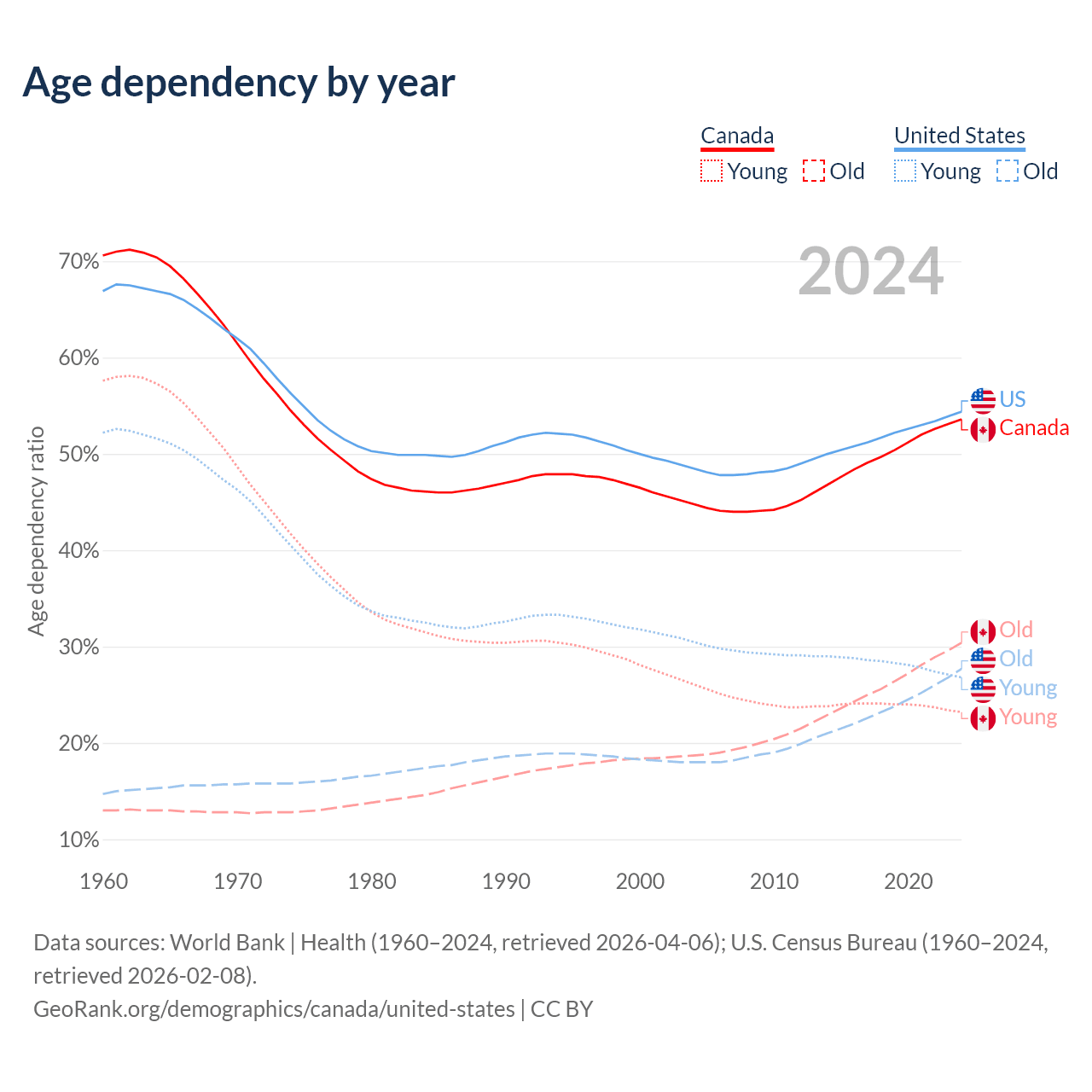 - Canada is ranked 38/196 by median age (oldest to youngest) vs 50/196 for the United States.