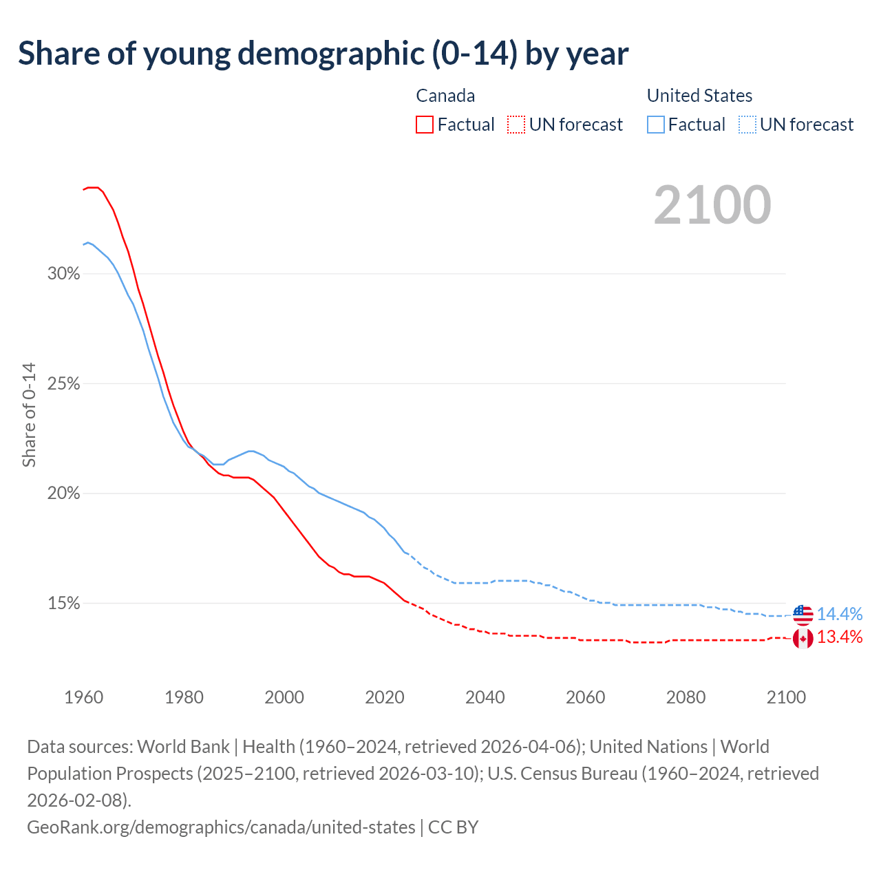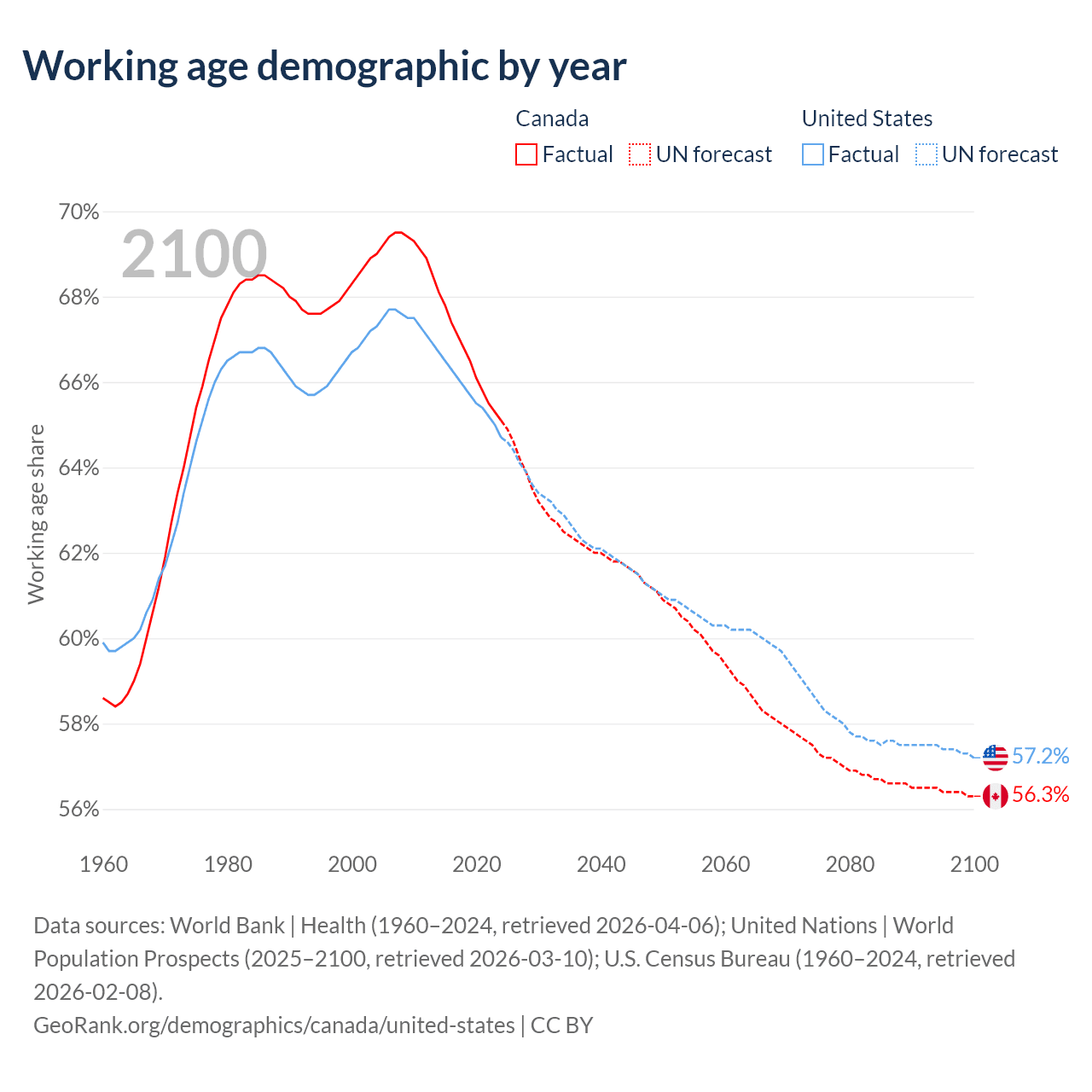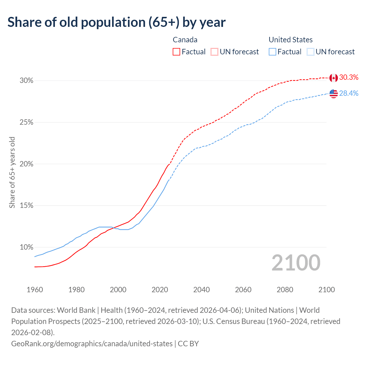 Median age Canada vs United States, 1960-2100