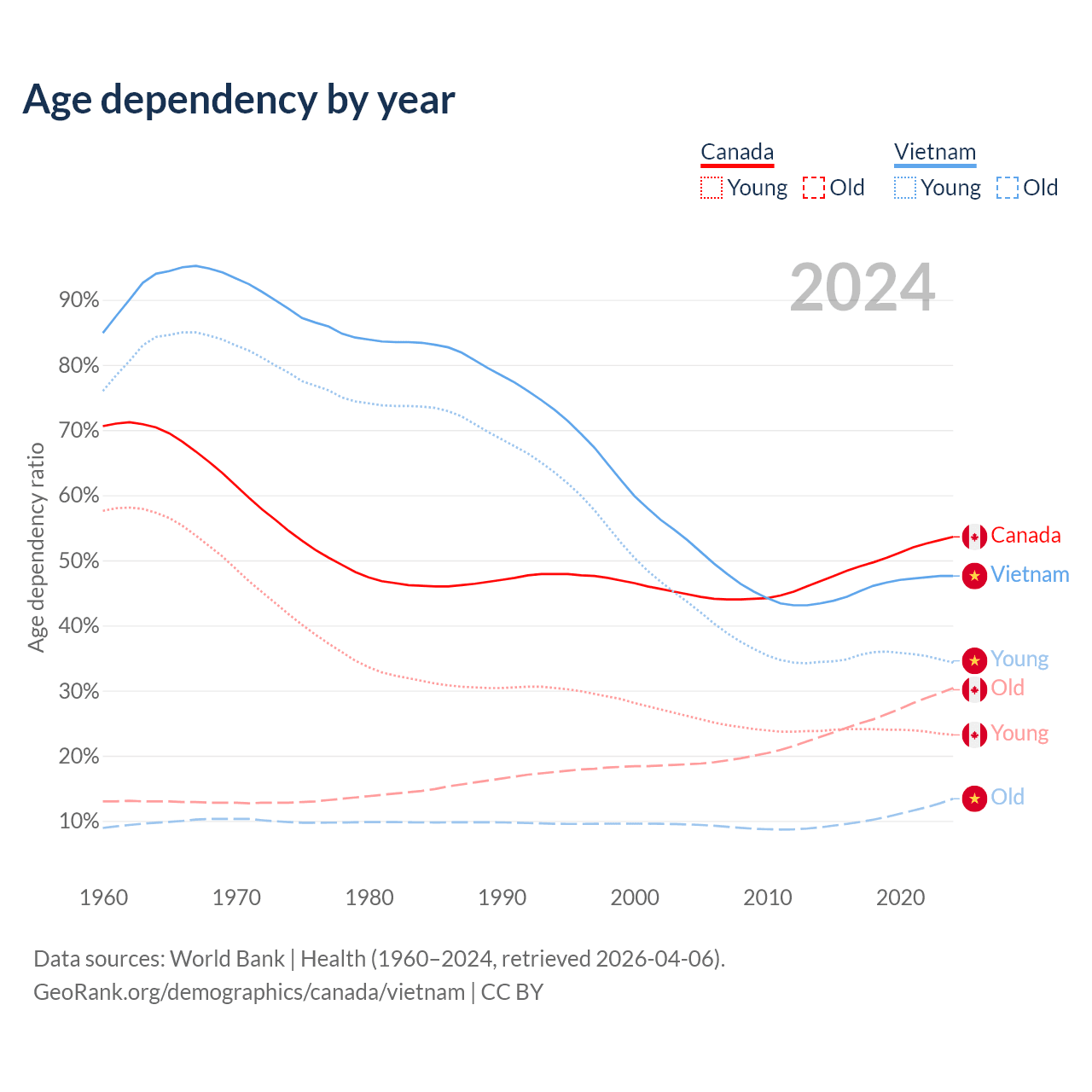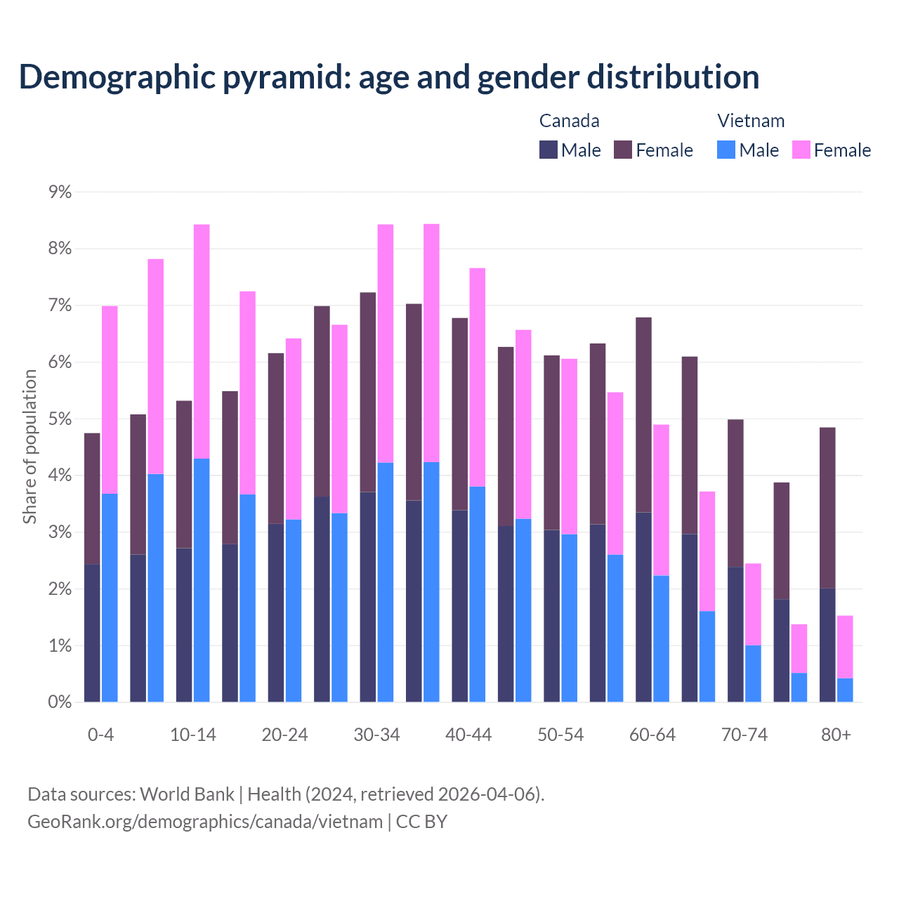 - Canada is ranked 38/196 by median age (oldest to youngest) vs 84/196 for Vietnam.