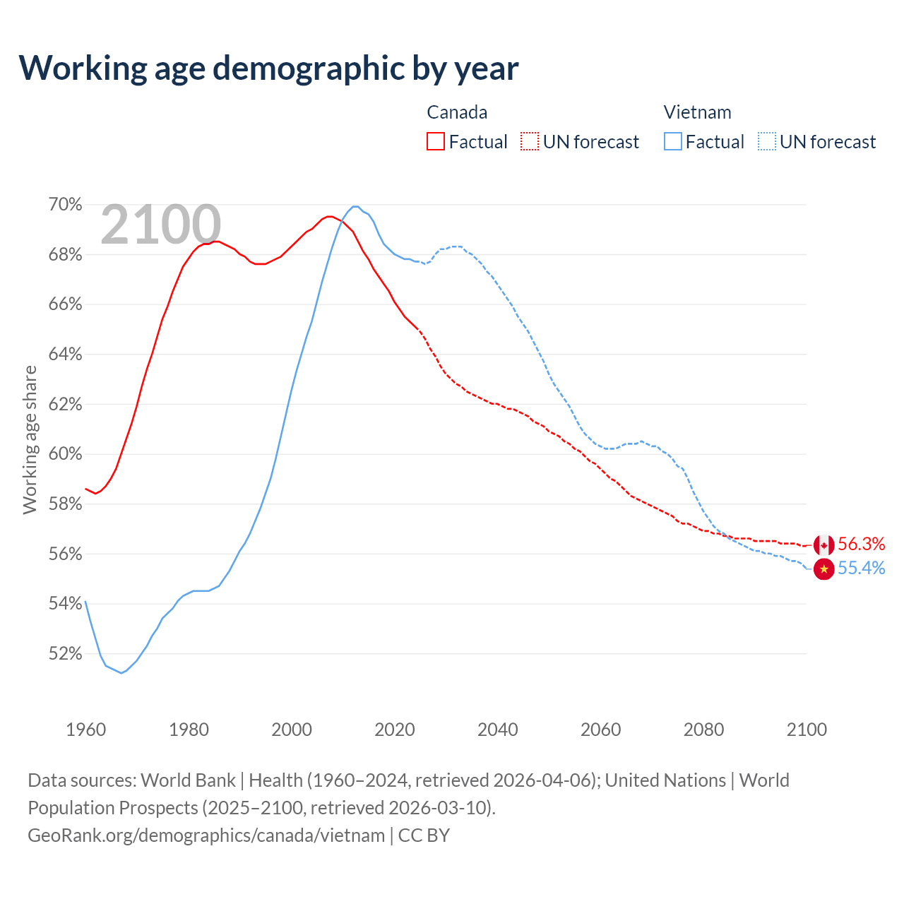 - Canada has 27.5M working age adults (aged 15-64) vs 69.3M in Vietnam.