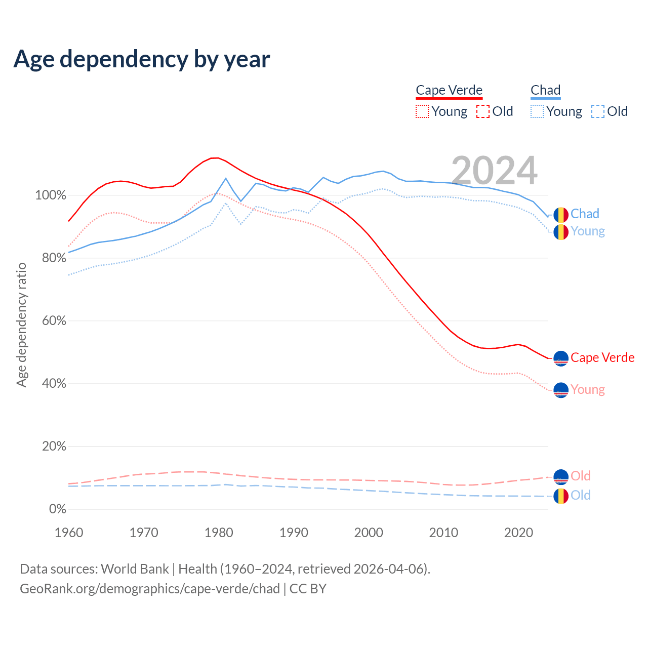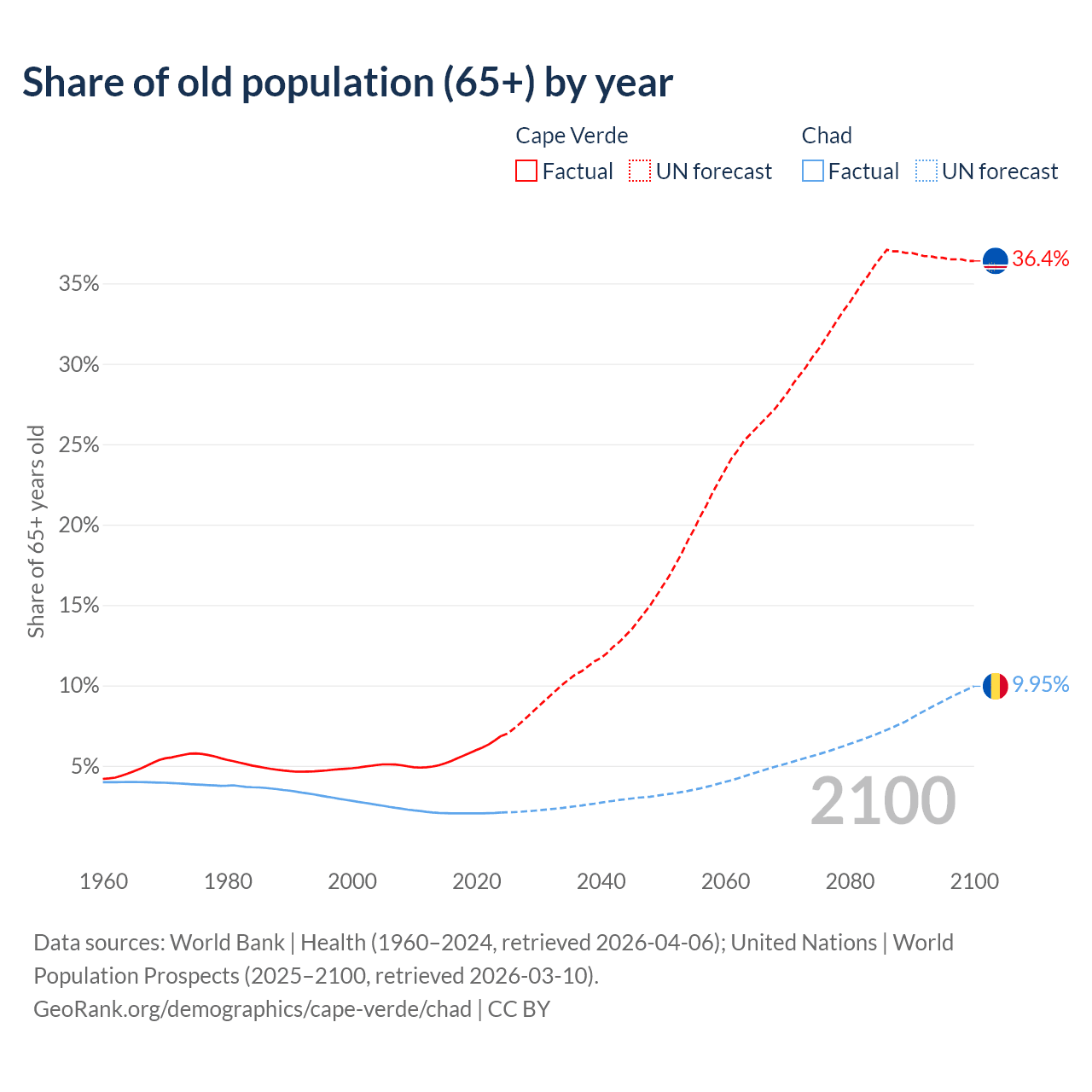 - The share of old-age demographic (65+) in Cape Verde is 6.86% vs 2.1% in Chad.