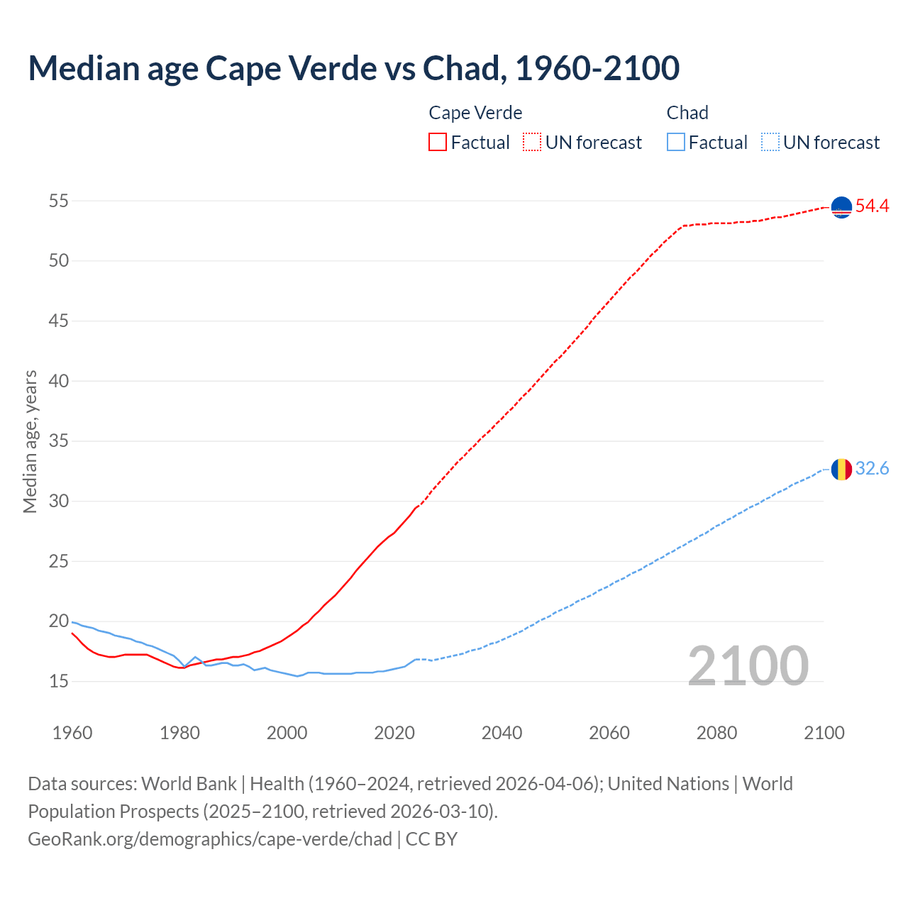 - Cape Verde is ranked 110/196 by median age (oldest to youngest) vs 192/196 for Chad.