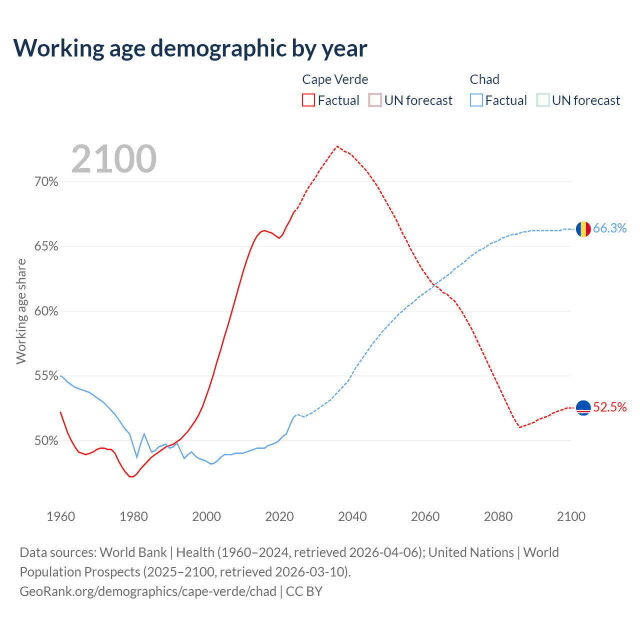 - Cape Verde has 359K working age adults (aged 15-64) vs 11.3M in Chad.