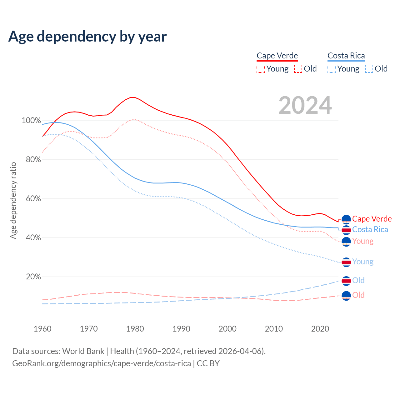 - The share of young demographic (0-15 years old) in Cape Verde is 25.5% vs 18.8% in Costa Rica.