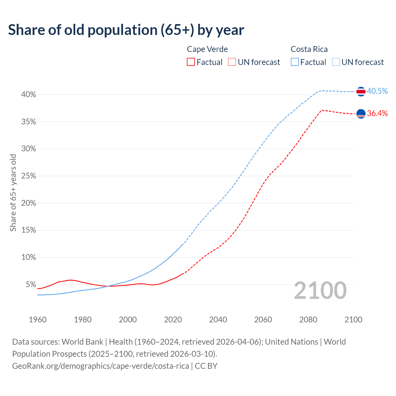 - The share of old-age demographic (65+) in Cape Verde is 6.86% vs 12.2% in Costa Rica.