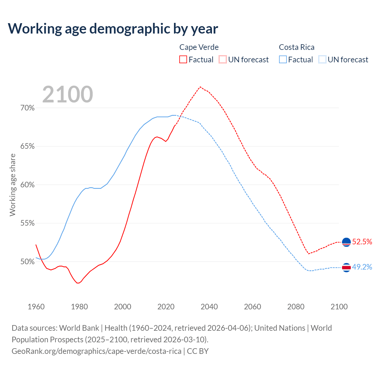 Median age Cape Verde vs Costa Rica, 1960-2100