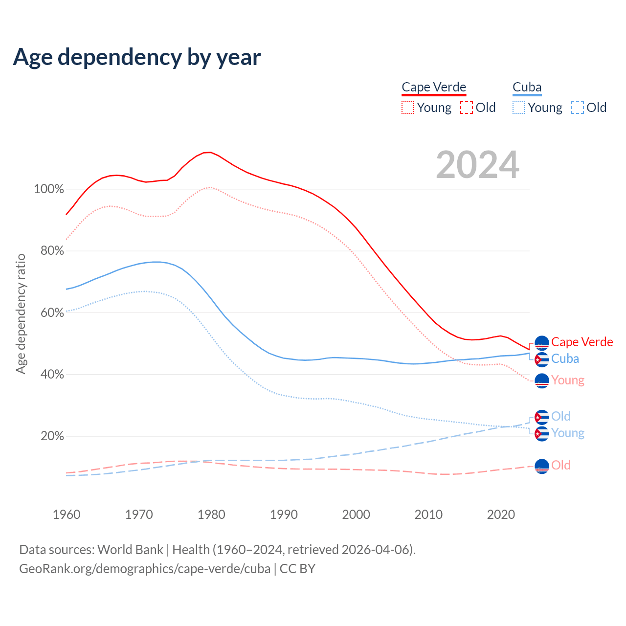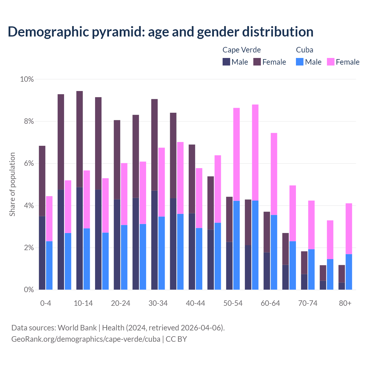 - Cape Verde is ranked 110/196 by median age (oldest to youngest) vs 27/196 for Cuba.