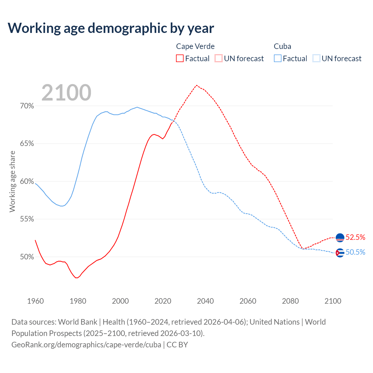 - As of 2026, the population of Cape Verde is 530K vs 10.9M in Cuba - 20.5 times difference.