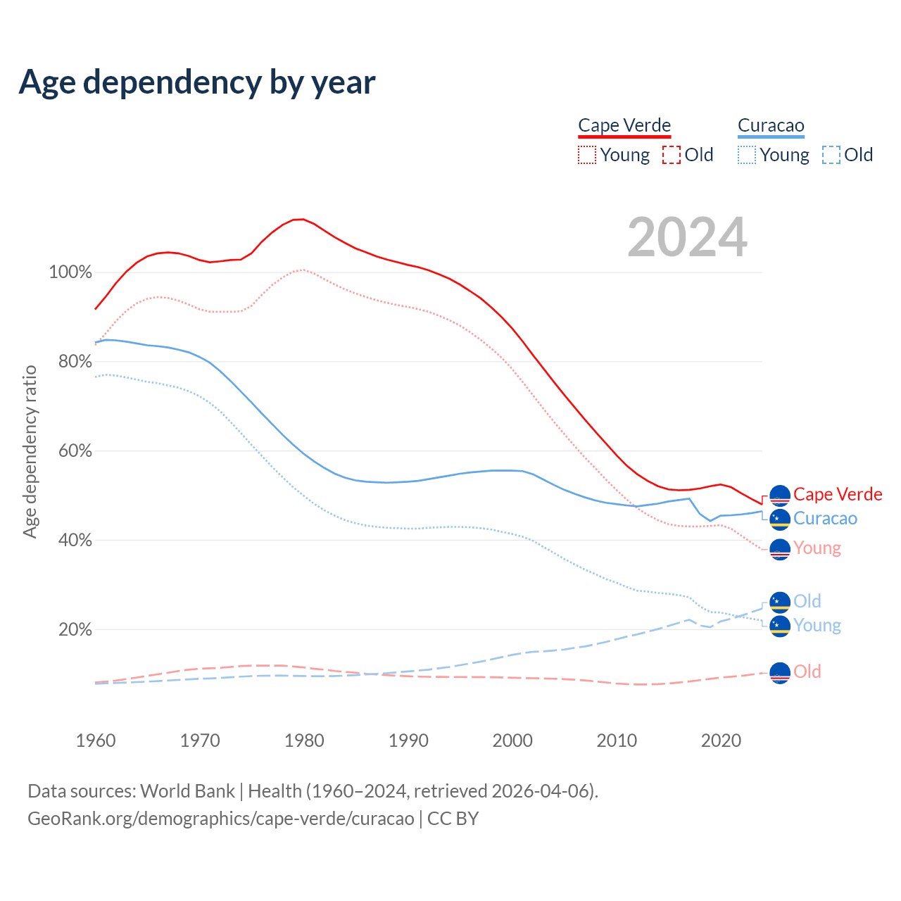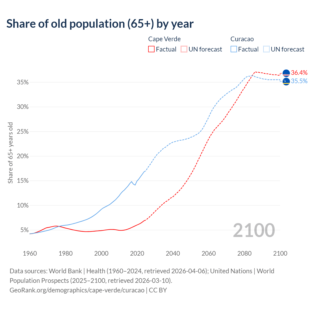 - The share of old-age demographic (65+) in Cape Verde is 6.86% vs 16.8% in Curacao.