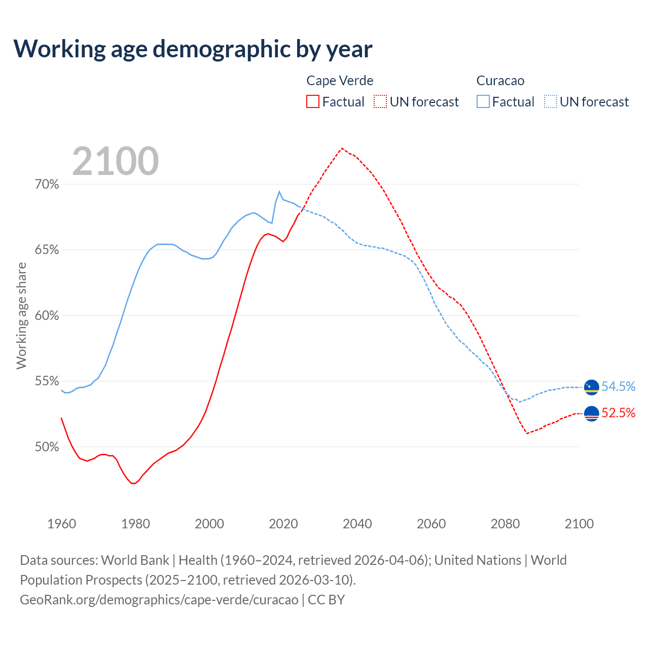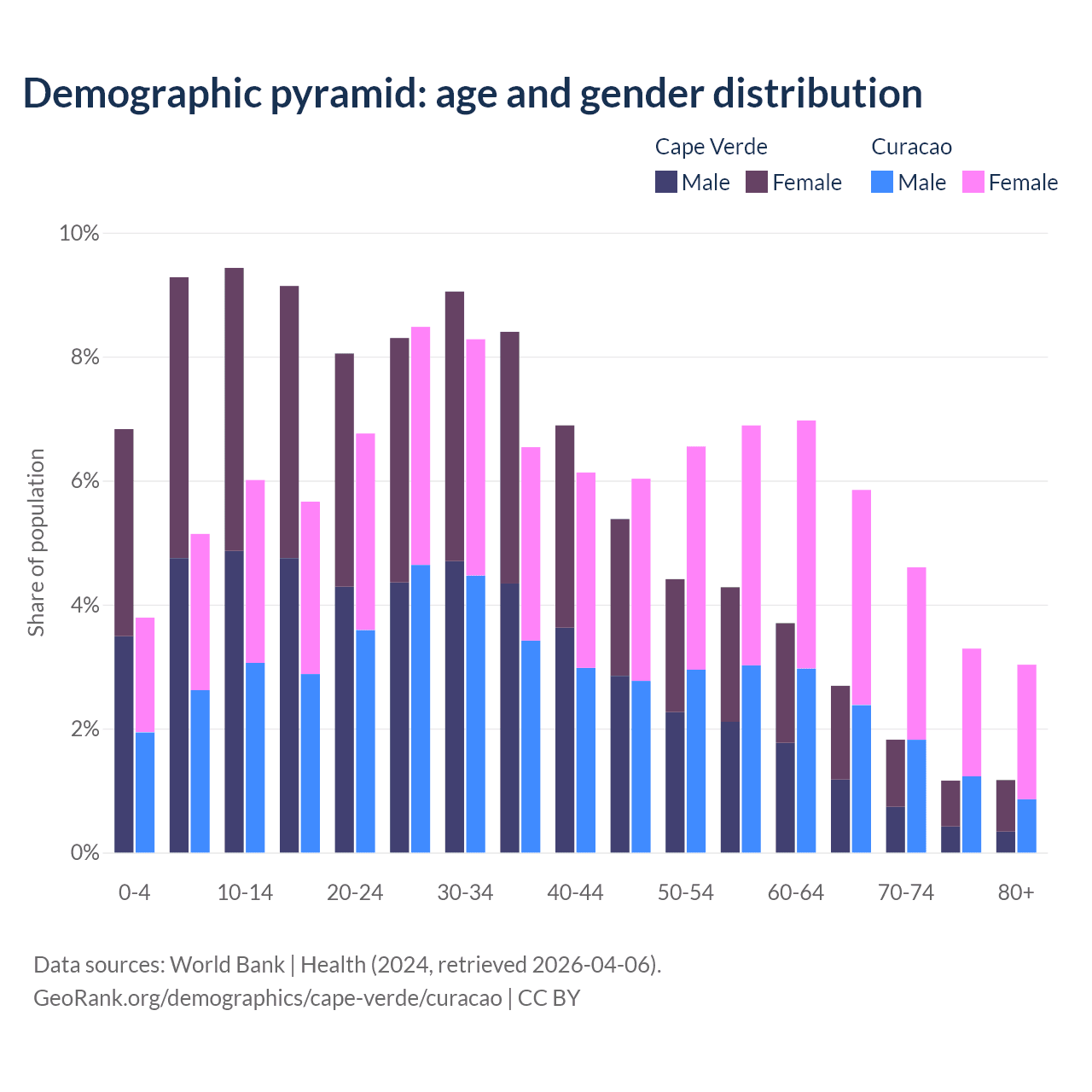 - As of 2026, the population of Cape Verde is 530K vs 156K in Curacao - 3.4 times difference.